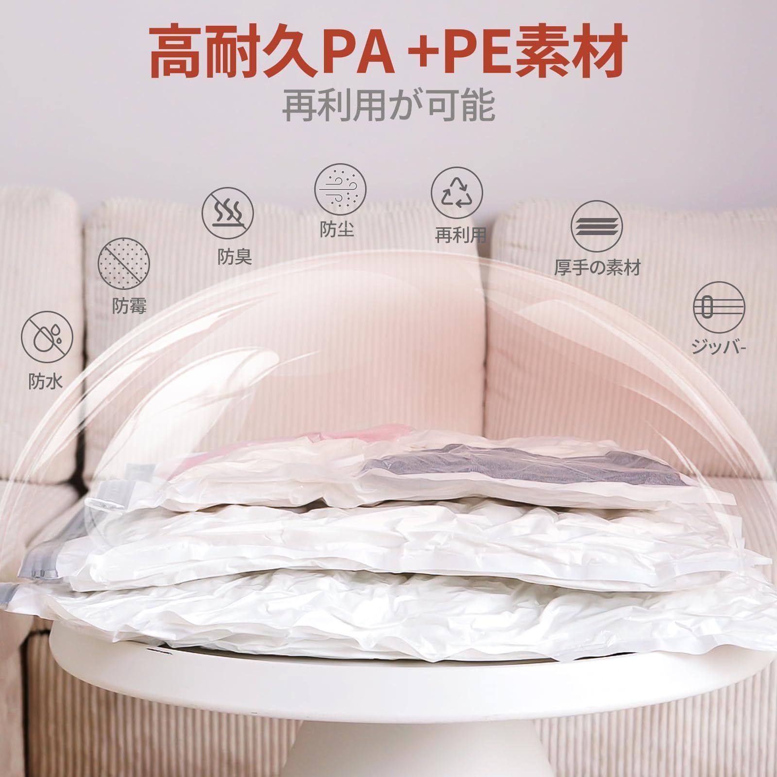 【高密封 高耐久】真空収納袋はダブルバックルで密封されており、空気が漏れないことをします。チャック部分は空気が漏れない二重チャック構造になっています。また、ダニやカビなどの侵入を防ぎ、常に清潔に保管して頂けます。そして、我々の素材がPAとPEの高品質ブレンドから作られています、同じ製品の厚さより30%厚くでき、丈夫で柔らかく素材です