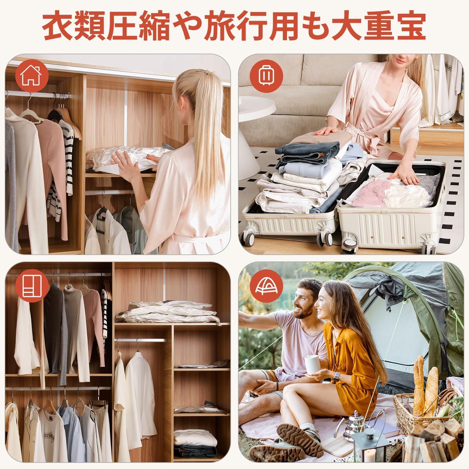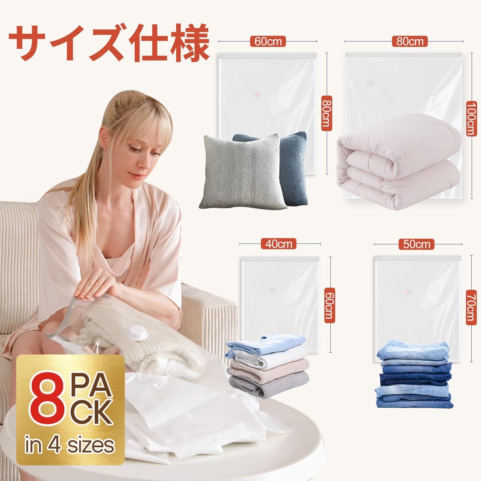【4サイズ8枚セット】圧縮袋8枚入、サイズ: 100×80cm×2枚、80×60cm×2枚、70cm×50cm ×2枚、60×40cm ×2枚+1 最新 圧縮袋 電動ポンプ付き