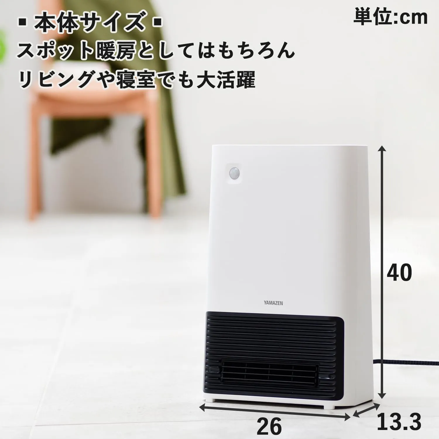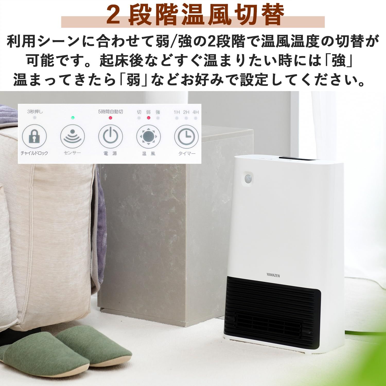 【大風量】電源ONですぐに出てくる強力大風量の温風で、即座にあったか。スポット暖房としてはもちろん、リビングや寝室でも大活躍です。