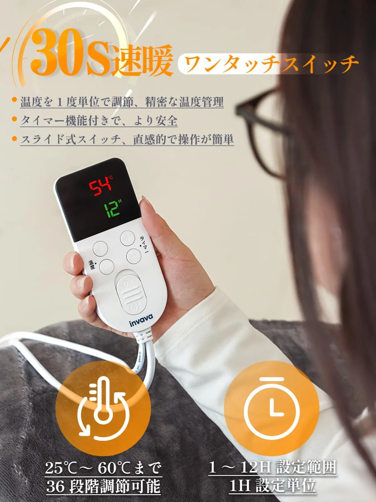 【最初にご確認ください】 初期不良等の際は評価前に取引メッセージにてご連絡お願い致します。 5日以内でしたら対応致します。 評価後の対応は致しませんのでご了承ください。 ショップ情報記載事項のご確認をお願いいたします。 Amazonのアウトレット品 開封後、中身の確認のみ 以下記載のASINをブラウザより検索し、Amazonページ参照ください ASIN:B0F8HWHSLS ※箱に伝票跡やダメージがあります。 ※アウトレット品の為、傷や汚れがある場合がございます。予めご了承ください。 簡単操作で安心 - 大きなコントローラーの画面で、25℃〜60℃の温度調節が自由にでき、1〜12時間のタイマー機能と自動オフ機能も搭載。特に高齢者や機械が苦手な方にも安心してご使用いただけます。 多用途で使い勝手抜群 - ソファや椅子に敷いたり、床に広げてごろ寝用としても使える便利なサイズ。ふわふわで柔らかな肌触りが、どんな使い方でも快適さを提供します。 丸洗い可能で常に清潔 - マット本体は丸洗い可能で、いつも清潔な状態を保てます。手洗い推奨ですが、洗濯機使用の場合はネットに入れ、ウール・手洗コースをお使いください。さらに、洗濯袋が付属しており、洗濯がより簡単です。