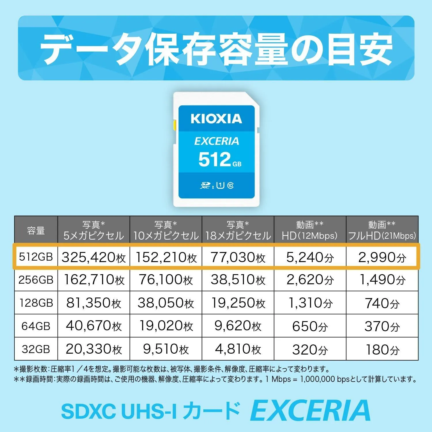 【日本製】SDカード 512GB SDXC UHS-I Class10 読出速度100MB/s 国内正規品 メーカー保証5年 KLNEA512G サイズ: 512GB UHS-I、UHSスピードクラス1、SDスピードクラス10 読出速度:100MB/s 動作温度-25℃~85℃、耐X線、耐静電気、ヒューズ搭載 日本製 Made in JAPAN 保証期間:製品お買い上げ日より5年間 著作権保護機能(CPRM)非対応 キオクシア(旧東芝メモリ) EXCERIA SDメモリカード UHS スピードクラス 1 (U1)に準拠しフルHDの撮影に適しています。 本製品の詳細情報は、メーカーWebサイトの製品ページでご確認ください。