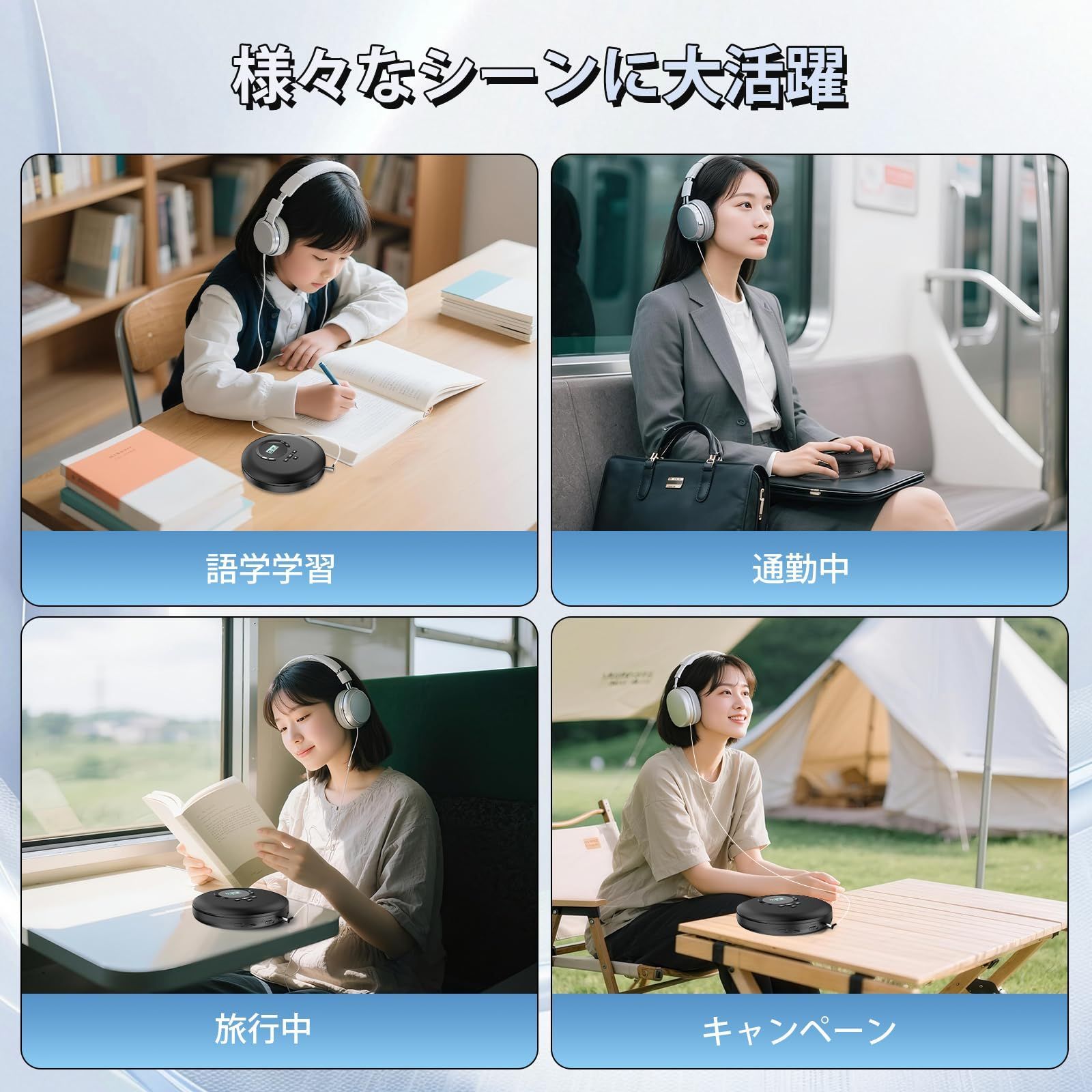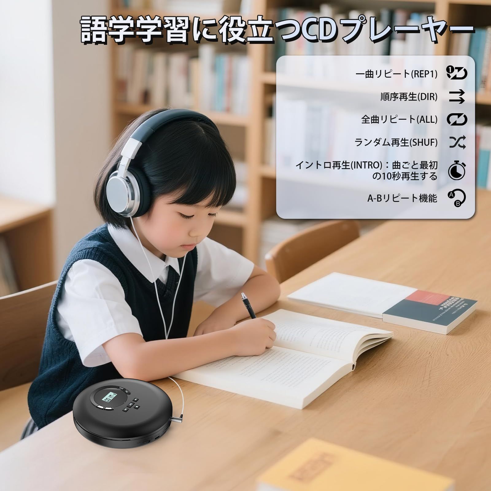 【語学学習に役立つCDプレーヤー:】このCDプレーヤーは一曲リピート(REP1)、順序再生(DIR)、全曲リピート(ALL)、ランダム再生(SHUF)、イントロ再生(INTRO):曲ごと最初の10秒再生するという5つの再生モードはあります。また、A-Bリピート機能がありますので、語学学習に一番適するCDプレーヤーです。