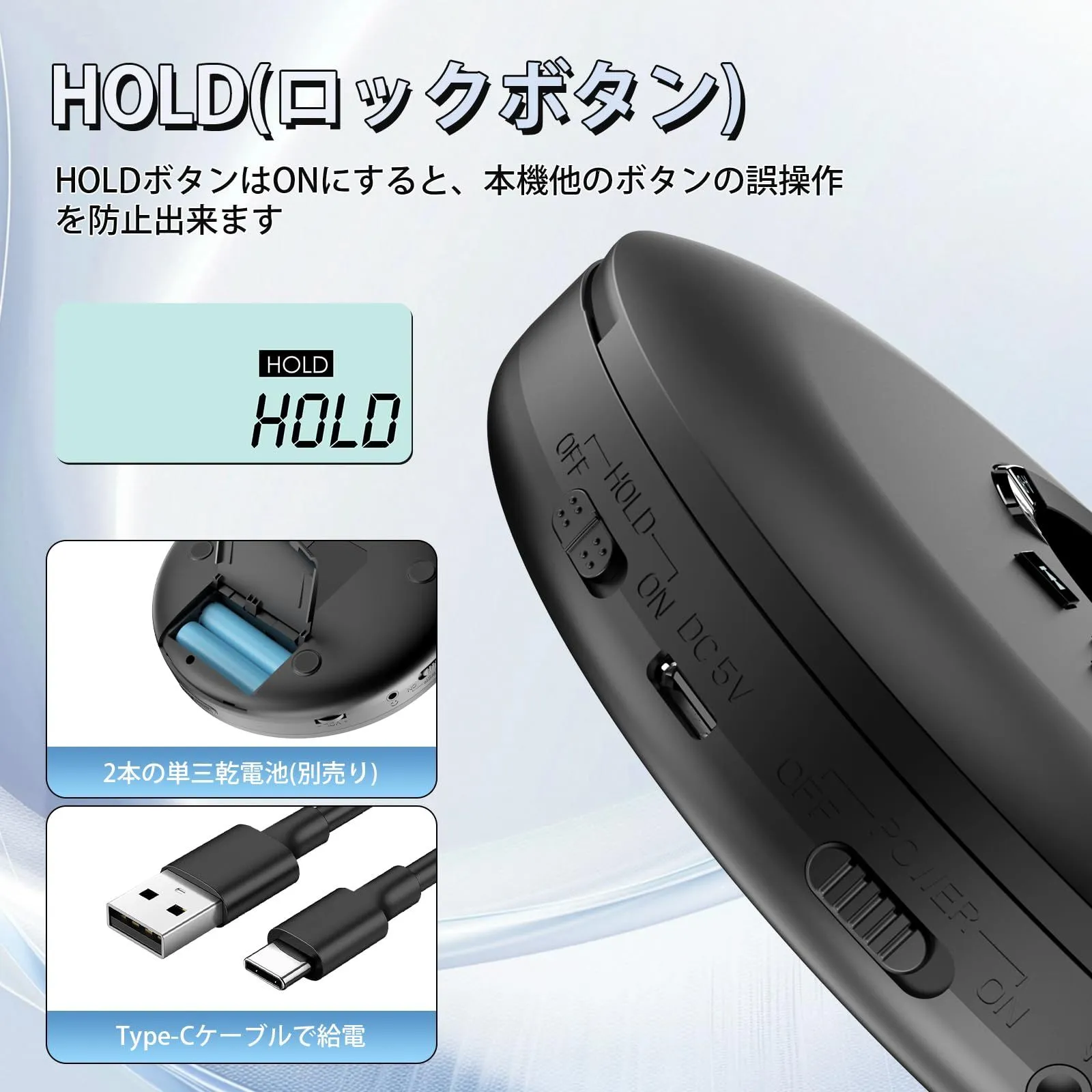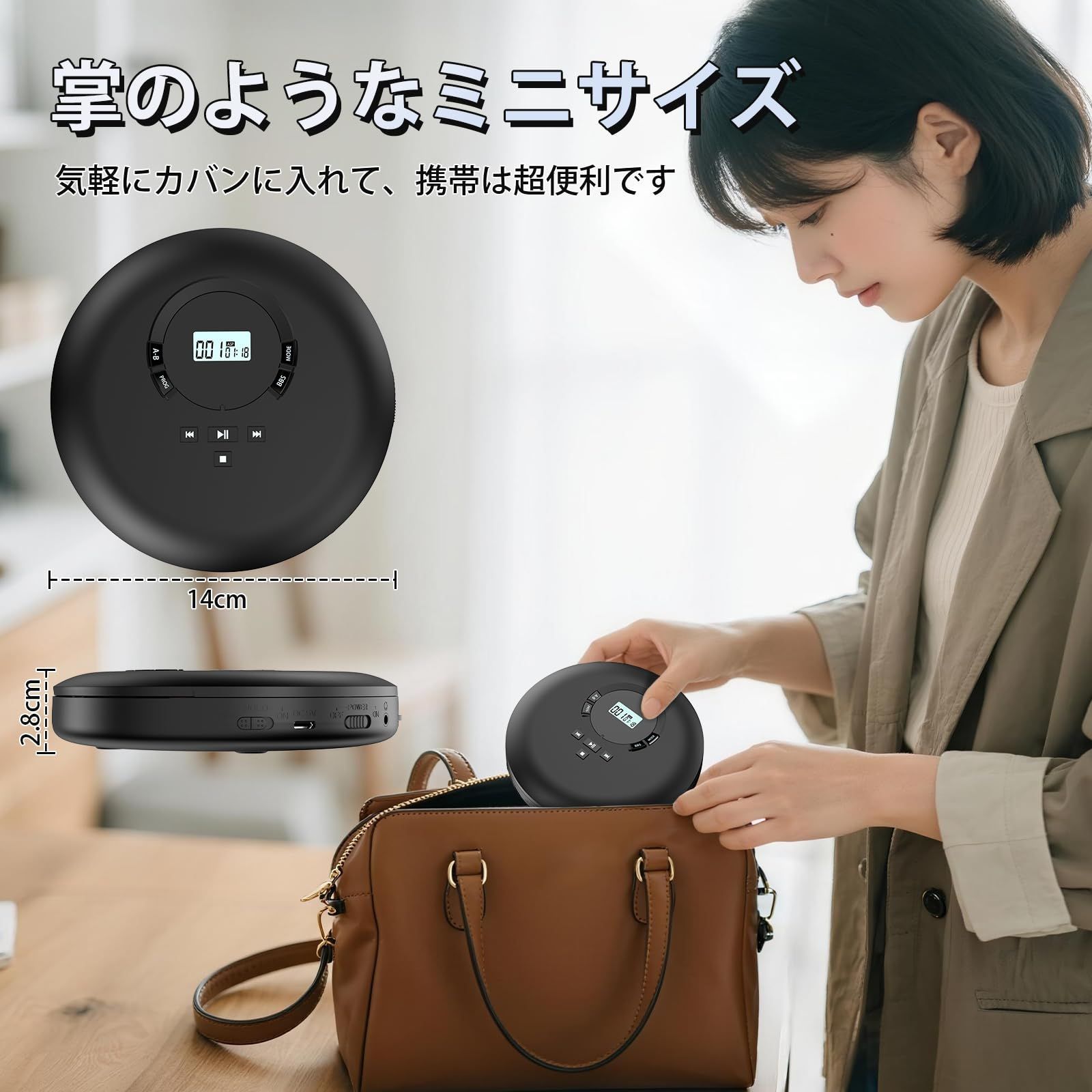 【操作簡単のポータブルCDプレーヤー:】製品の蓋にLCDディスプレイと主な操作ボタンだけのシンプルなデザインですので、一目で簡単に操作が可能です。高齢者にも適します。(※注意:CDプレーヤーが正常に操作したい場合は、底面のHOLDキーをOFFにしてください。)