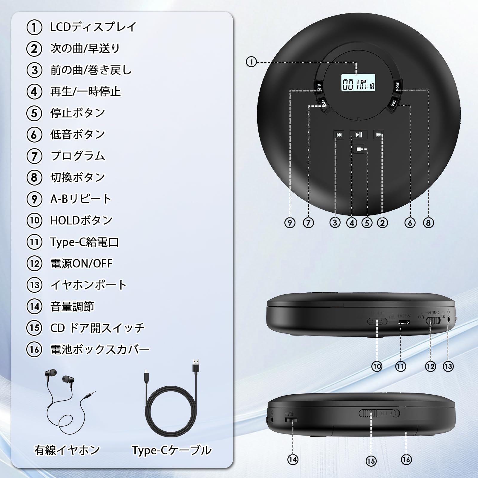 【ASP防振機能&プログラム機能:】製品はASP防振機能が内蔵されており、自動的に音飛びを防ぎます。また、製品はプログラム機能は搭載して、お客様のお好きな曲だけを再生でき、また、お好きな順番で再生できます。最大32曲まで選択できます。★ご注意:本製品はすべてのブルーレーディスクに対応できません★。