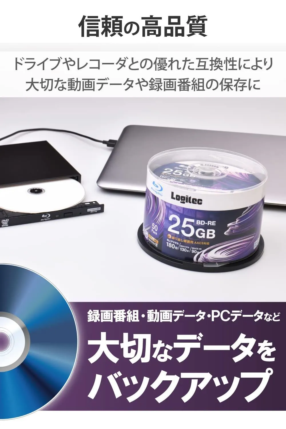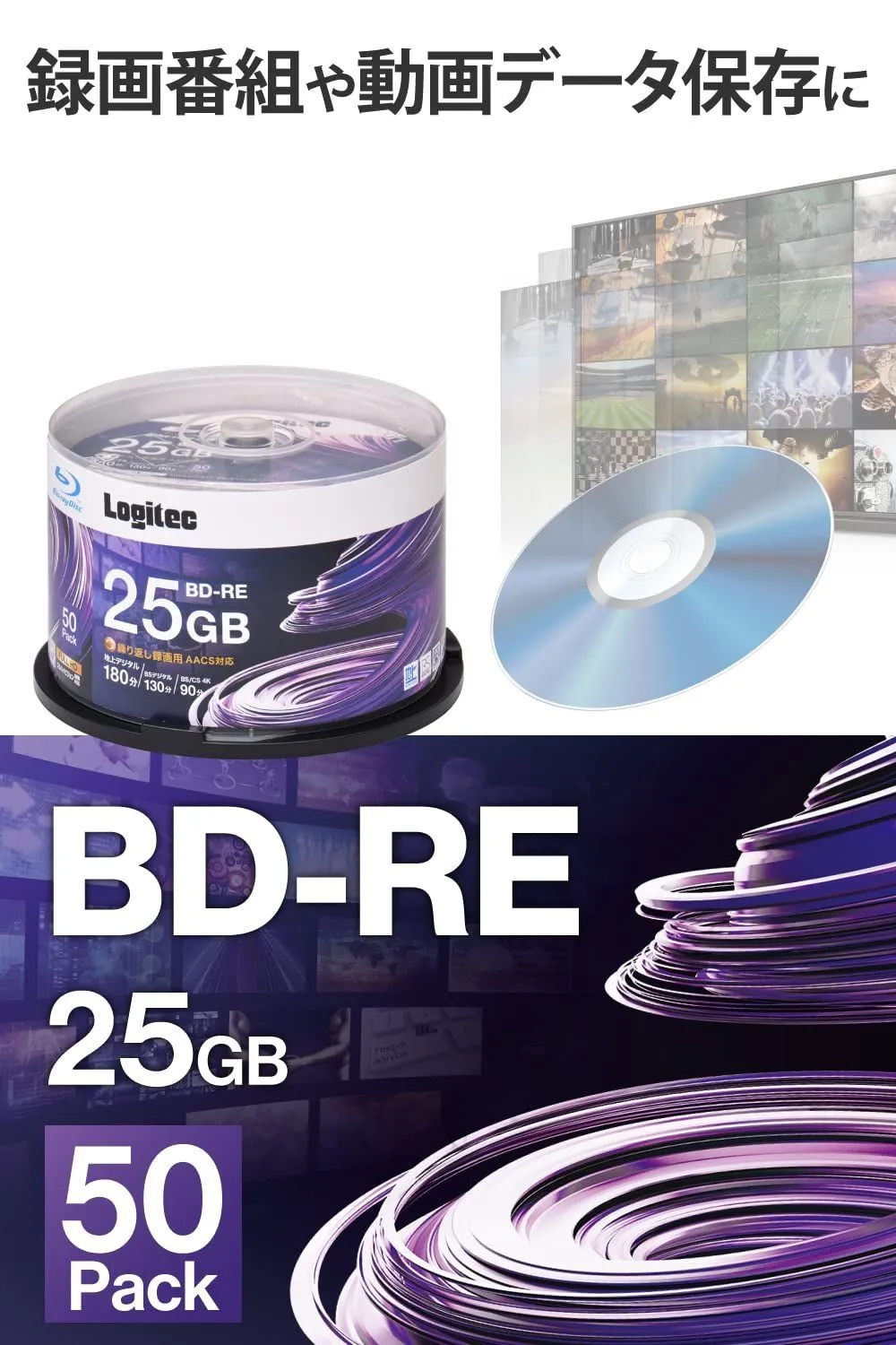 【迅速発送】ロジテックダイレクト BD-RE AACS対応 ブルーレイディスク Blu-ray Disc 2倍速 くり返し録画用 記録用 25GB 記録メディア スピンドルケース 50枚入り LM-BRE25VWS50W