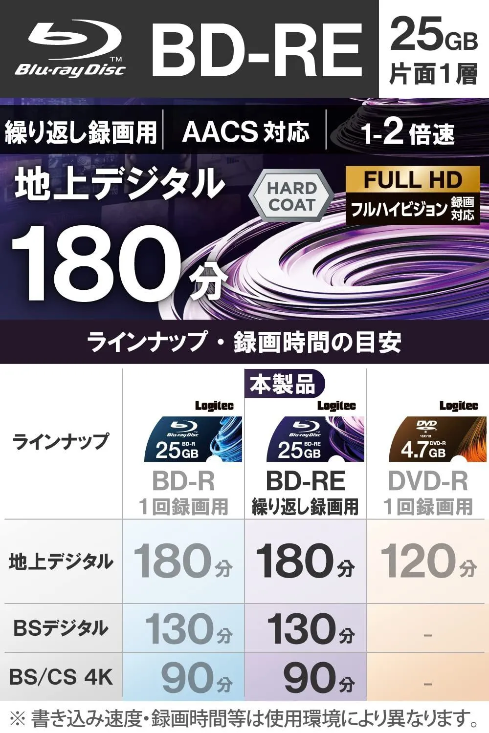 【テレビ番組録画に対応】スピンドルケースに50枚入ったAACS対応BD-RE(くり返し記録用)です。容量25GB、地上デジタルで180分、書き込み速度は2倍速です。何度もくり返し書き込みができ、一度記録したデータを消去して上書きしたり初期化することができます。レコーダーなどでデジタル放送の「ダビング10※」番組など録画することができます。 ※Blu-rayレコーダー及びプレイヤーが対応している必要があります。