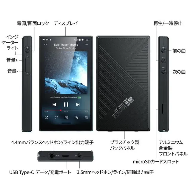 ●多機能インターフェース。用途に合わせた接続を実現 《仕様》 材質:アルミニウム合金、プラスチック サイズ:約120.7×68×13mm 重量:約156g(クリアケースのぞく) プロセッサー:Snapdragon680 メモリ:4GBRAM+64GBROM(52GB使用可能) ストレージ拡張:microSDカード対応(最大2TB) OSシステム:Android13 動作モード:Android/ピュアミュージックモード/USBDAC/Bluetooth受信 Wi-Fi ・2.4GHz/5GHz ・DLNA、AirPlay、Wi-Fi転送対応 DACチップ:CS43198×2 オペアンプ:SGM8262×2 ディスプレイ:4.7インチ高精細画面(750×1334) 出力端子 ・3.5mmヘッドホン/ライン/同軸出力 ・4.4mmバランスヘッドホン/ライン出力 ・USBType-C(USB2.0データ/充電/USBAudio) Bluetooth ・バージョン:5.0 ・送信コーデック:SBC/AAC/aptX/aptXHD/LHDC/LDAC ・受信コーデック:SBC/AAC/LDAC 対応フォーマット ・本体再生:384kHz/32bit、DSD256(Native) ・USBDAC:384kHz/32bit、DSD256(Native) ・USBAudio:768kHz/32bit、DSD512(DoP/D2P/Native対応) ・同軸出力:384kHz/24bit、DSD128(D2P/DOP) 最大出力 ・シングルエンド:最大245mW(32Ω、THD+N<1%) ・バランス:最大700mW(32Ω、THD+N<1%) S/N比:≧130dB ノイズフロア:<1.5μV 出力インピーダンス:<1Ω THD+N:<0.0006% バッテリー:3100mAh 連続再生時間 ・シングルエンド:最大16時間 ・バランス:最大12.5時間 充電時間:約2時間(5V2A充電) 付属品 ・PET保護シート(JM212026に貼り付け済) ・クリアケース(JM212026に装着済) ・USBType-CtoAケーブル ・クイックスタートガイド 商品番号:4562314020991set1