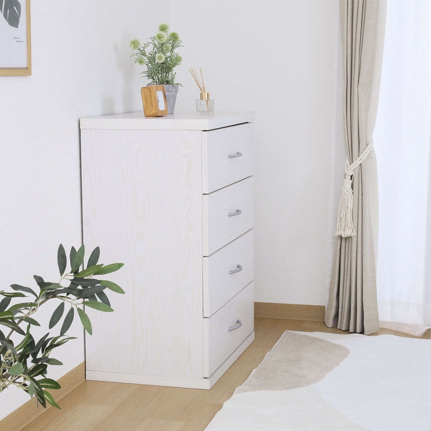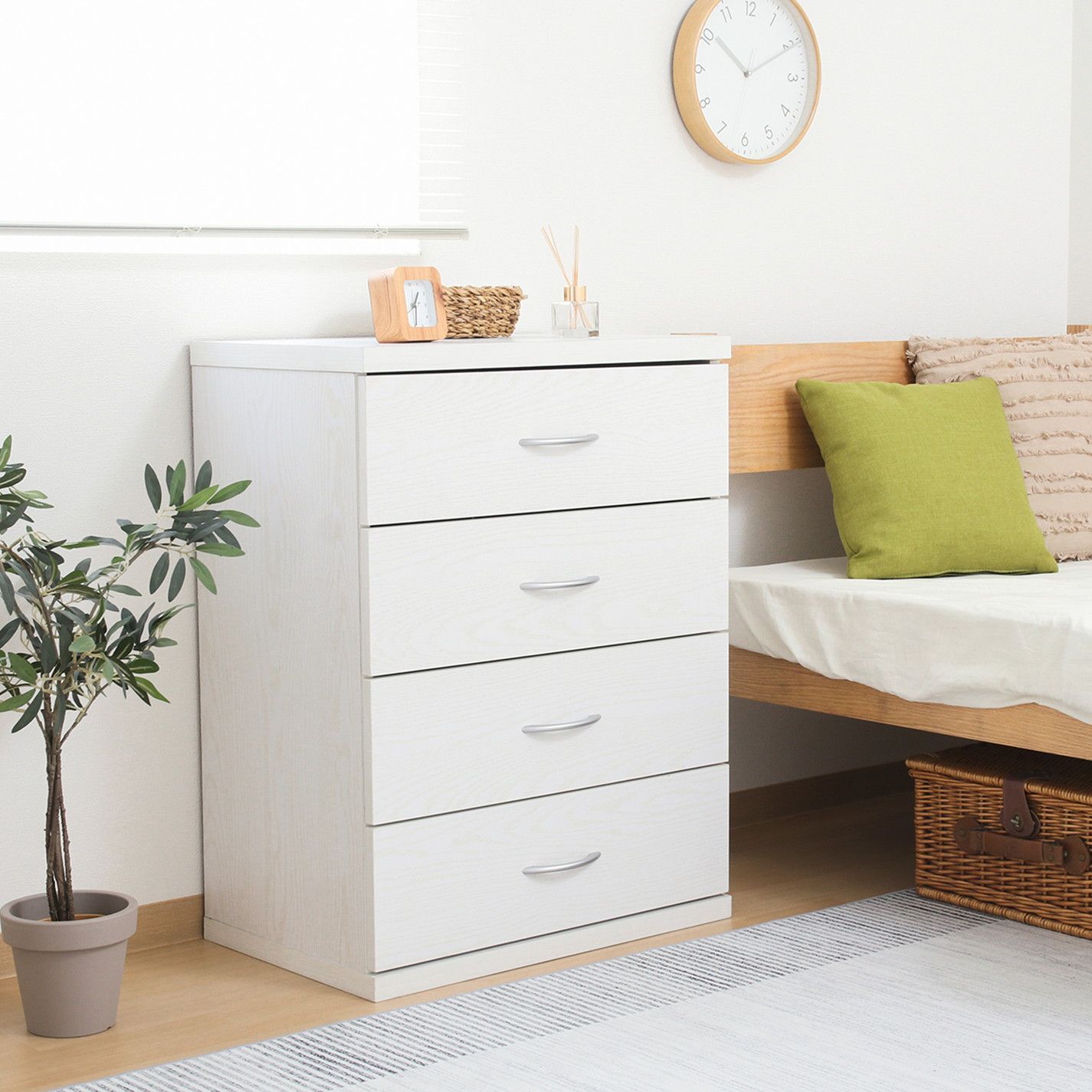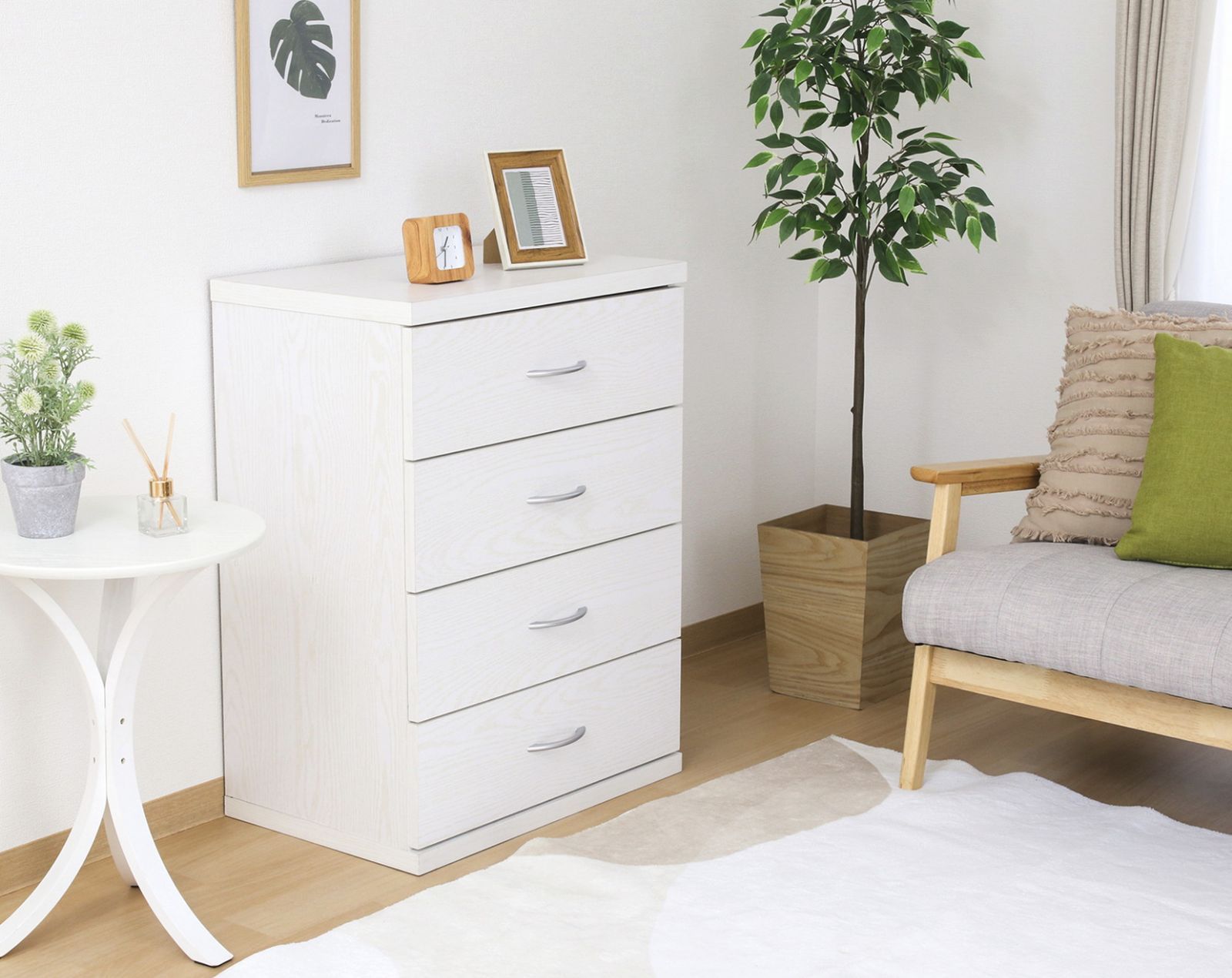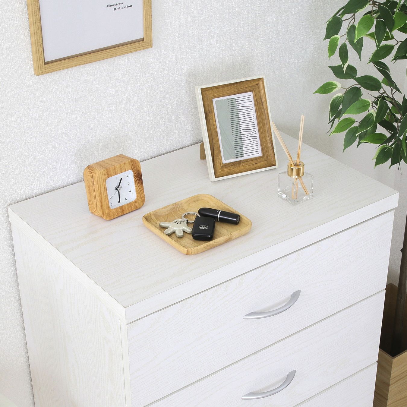 【商品名】 ラルゴ チェスト オークWH ※当ショップの商品はすべて送料無料となります。ただし、北海道、沖縄県、離島地域への配送はできません。予めご了承のほどよろしくお願いいたします。 ※こちらの商品はご注文後3営業日以内の発送となります。土日祝は出荷をお休みとさせて頂いております。発送までの日数は土日祝を除く営業日となりますのでご注意ください。予めご了承のほどよろしくお願いいたします。 お部屋に馴染むシンプルデザインコンパクトなチェストです。 引き出しの内寸は幅52.5×奥行32.5×高さ12.5cmで、タオルやシャツなどの衣類がたっぷり収納できます。 取っ手もシンプルな仕上がりで、和室洋室どちらも使用できます。 奥行サイズは41.5cmと少しスリムに作られているので、お部屋に置いても圧迫感がありません。 天板にはよく使うものを置いたり小物のディスプレイしたりと、シーンに合わせて様々な使い方ができます。 横揺れ防止のパーツも付いており、ぐらつきを防止してくれます。 W600×D415×H800mm / 23kg