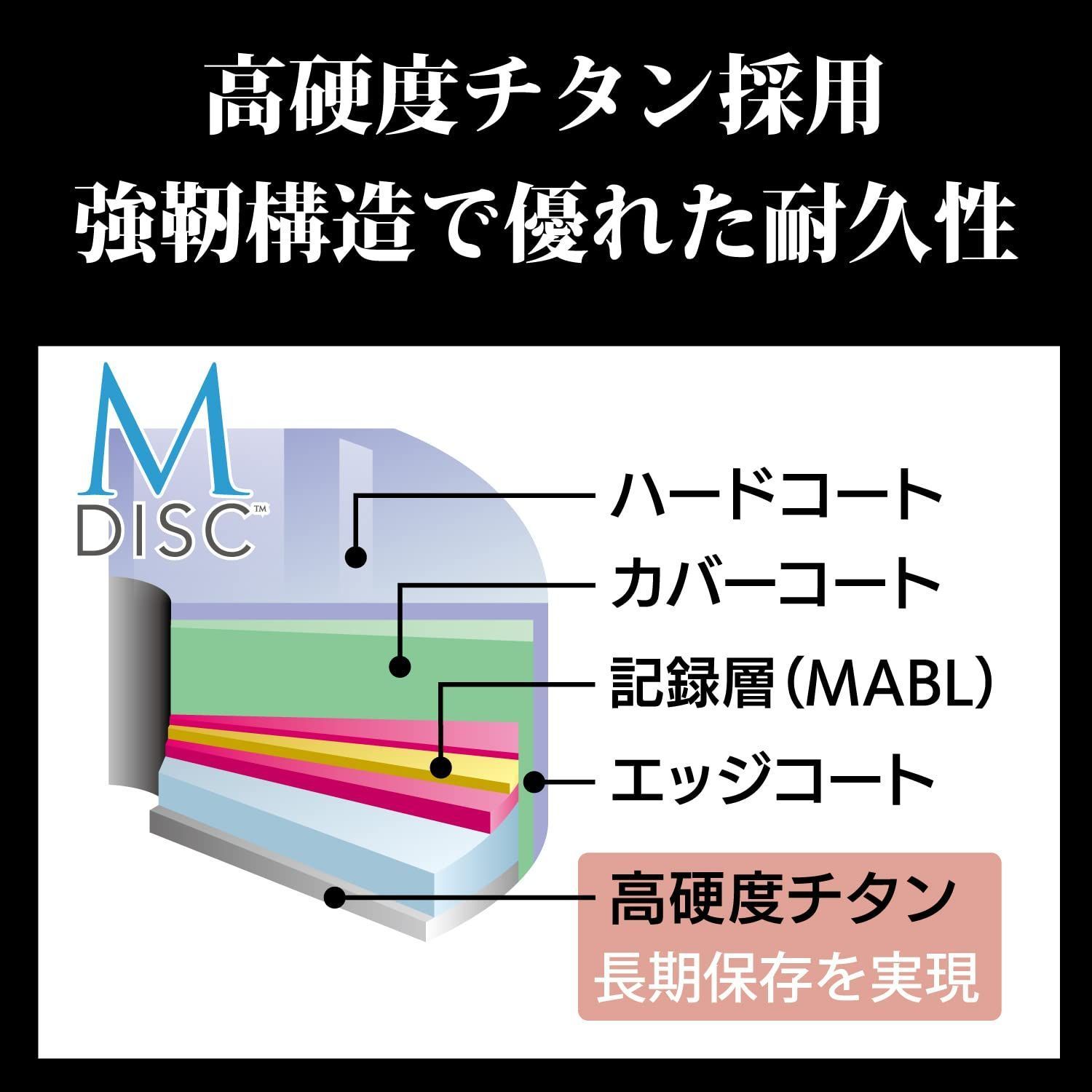 ■生涯保存用ディスク「M-DISC」 大切な記録を長く残すために耐久性にこだわったBD-R 生涯保存用ディスク「M-DISC」は、高硬度チタンを採用し、一般的なブルーレイディスクよりも、光・熱・湿度などによる経年劣化に強く、生涯保存・100年以上(※1)データを保存することができる耐久性に優れたハイグレードディスクです。 思い出の写真や映像、趣味のデータ、またはビジネスデータの保存に最適です。 ※1 国際基準規格 ISO/IEC 16963の測定基準に基づく。 ※ M-DISCロゴが付いているドライブでご使用ください。長期保存には、6倍速または4倍速による記録を推奨します。記録したディスクは既存のドライブでも再生が可能です。