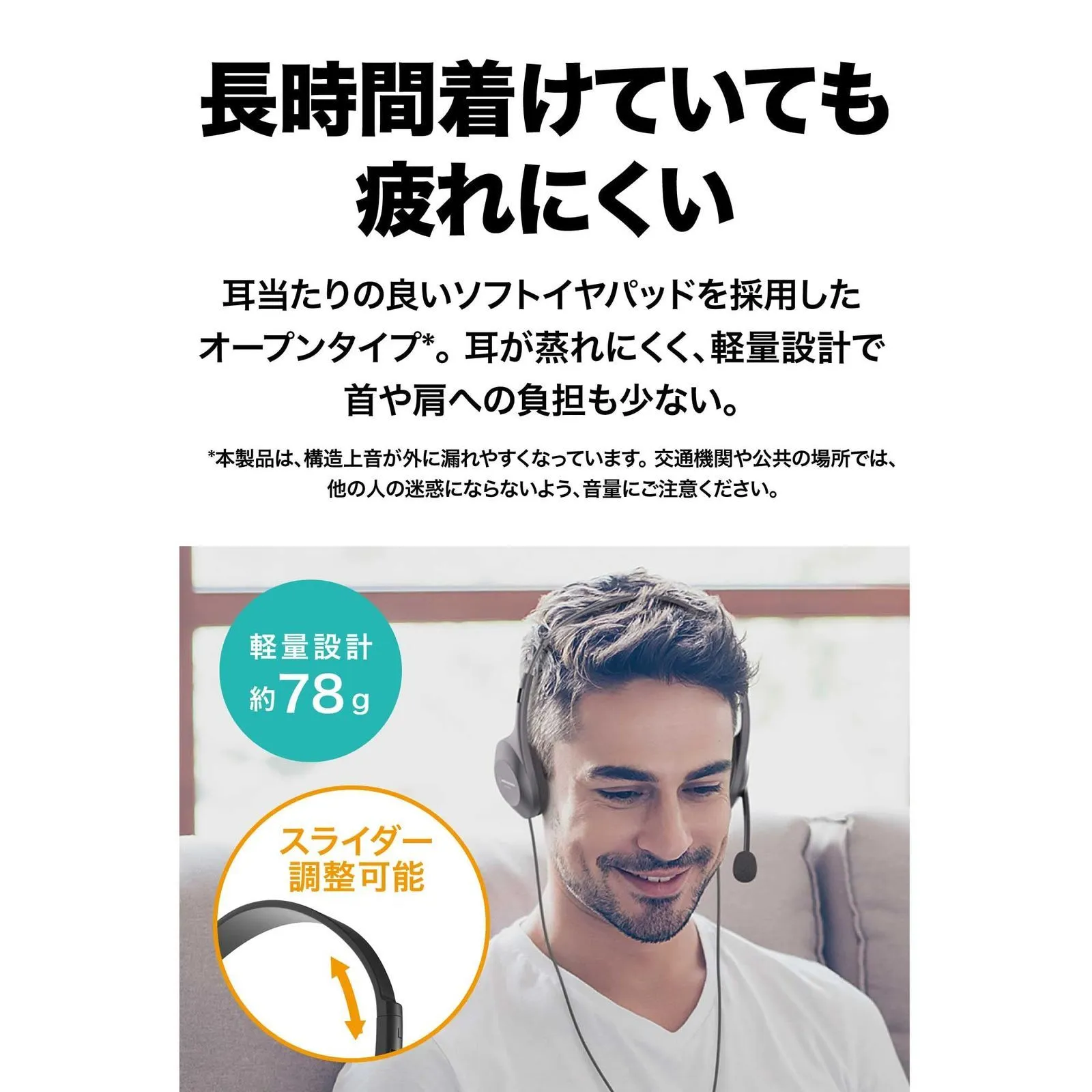 【長時間でも快適に使用可能】耳当たりの良いソフトイヤパッドを採用したオープンタイプ。耳が蒸れにくく、ずっと着けていても快適さをキープ。軽量設計で首や肩への負担も少なく、長めの会議でも安心して使用可能です。
