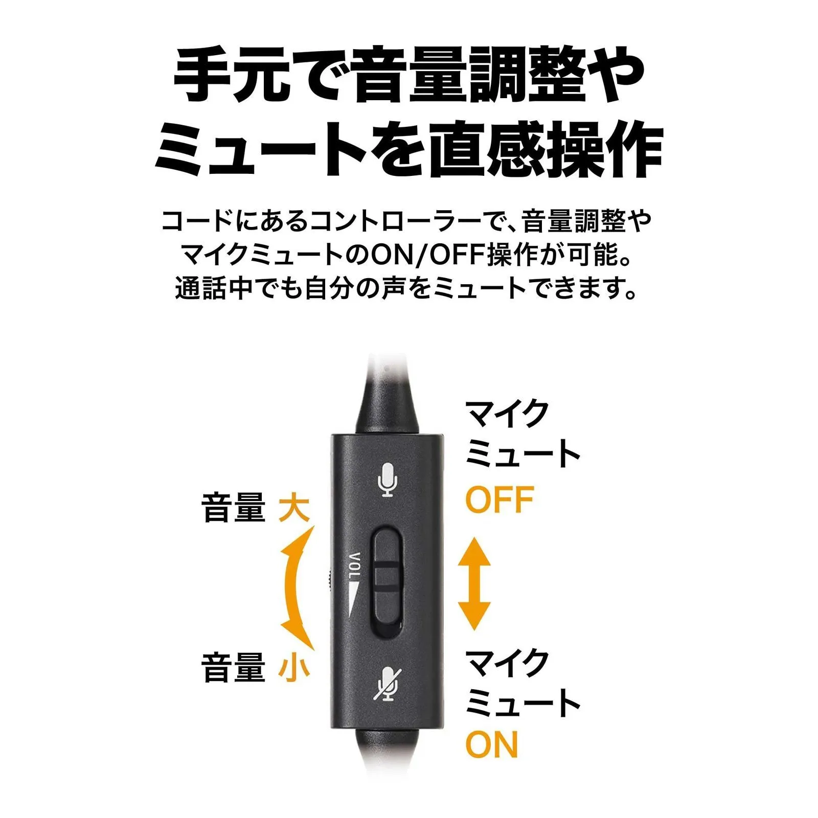 【手元コントローラーで直観操作が可能】コードにあるコントローラーで、音量調整やマイクミュートのON/OFF 操作可能。通話中でもPC 画面から目を逸らさずに、自分の声を瞬時にカットできます。