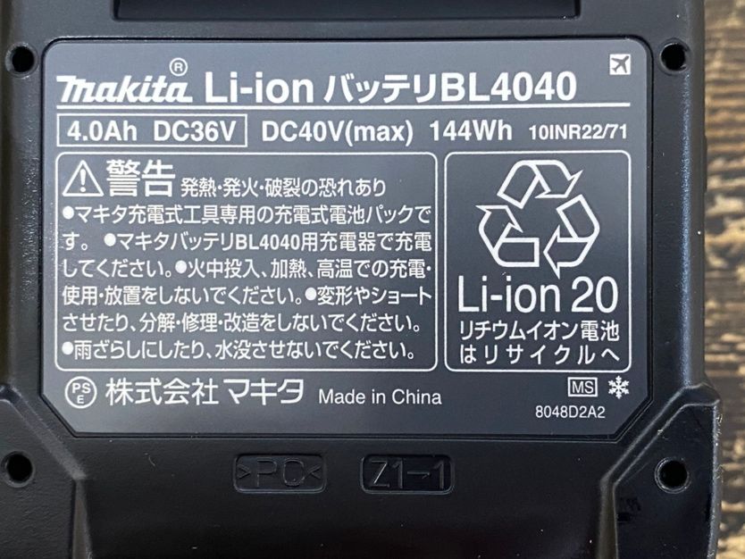 ◆バッテリー仕様・・・型番:BL4040 届出事業者:株式会社マキタ 容量等:DC36V/4.0Ah/144Wh