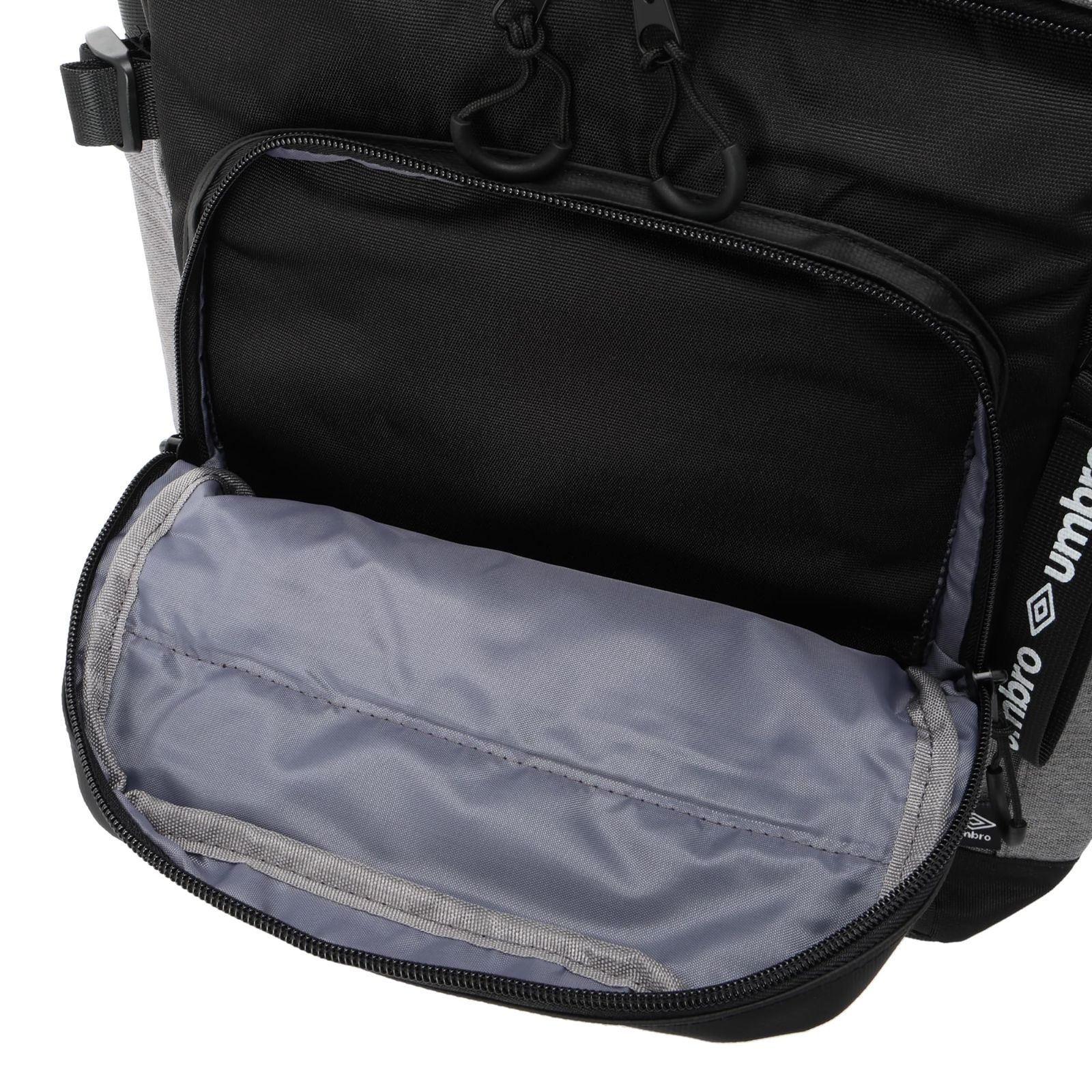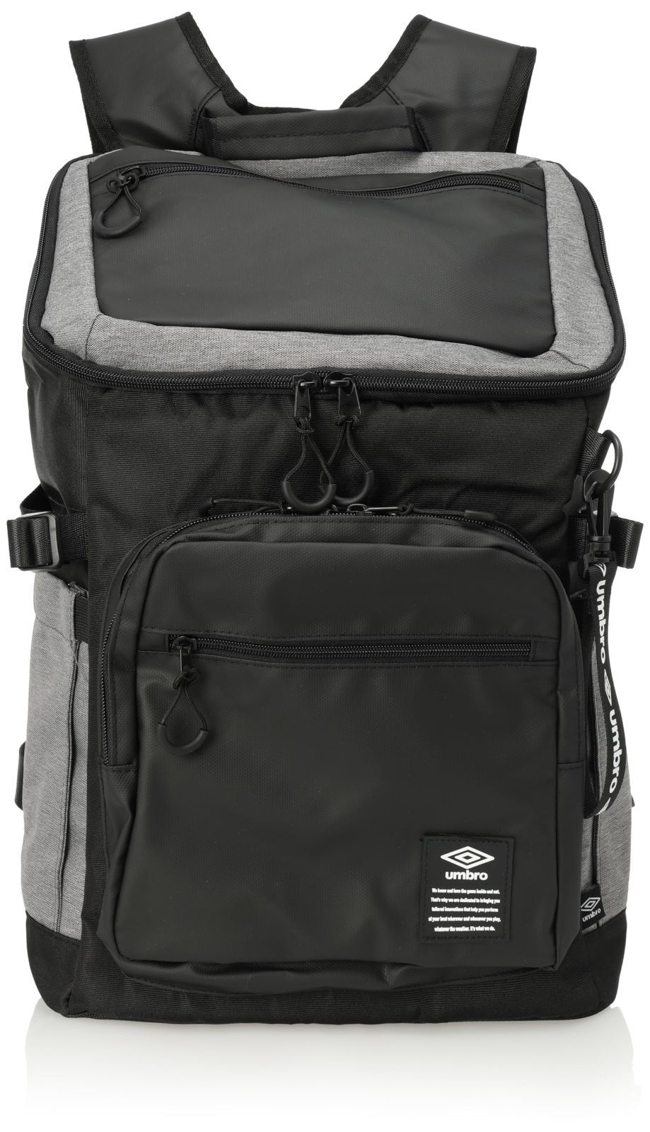 スポーツブランド<アンブロ>のスクエアリュックです。異なる3素材から作られたデザイン性高いリュック。背面は通気性とクッション性の高いf-touchを使用。またショルダー部分は肩にフィットし重心が安定するU字ショルダーを採用。長時間背負っていても負担がかかりにくくなっています。ポケットは全部で8つと収納面も充実。通勤・通学・習い事と年齢関係なくご使用いただけます。