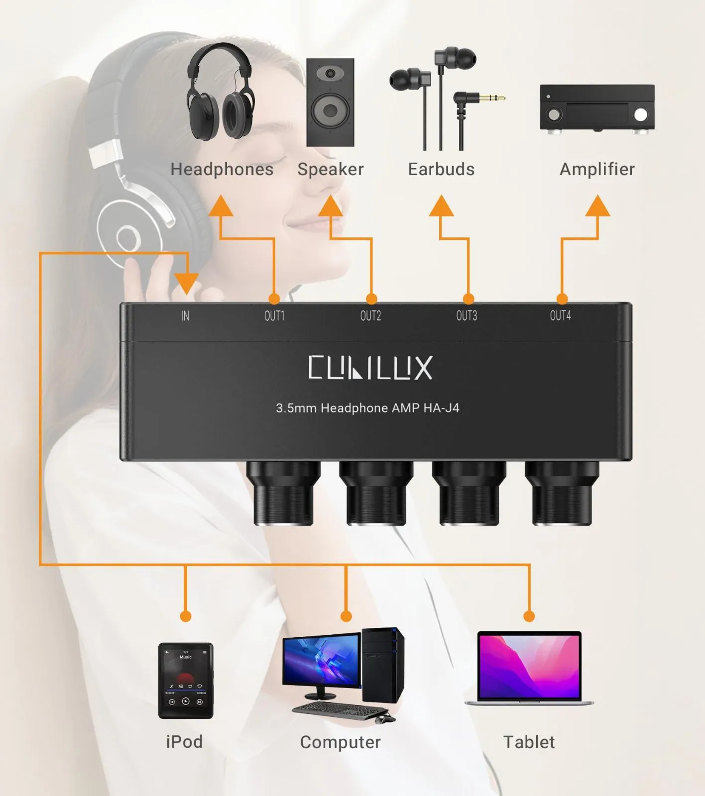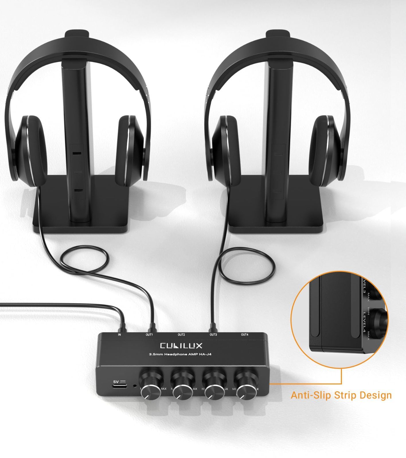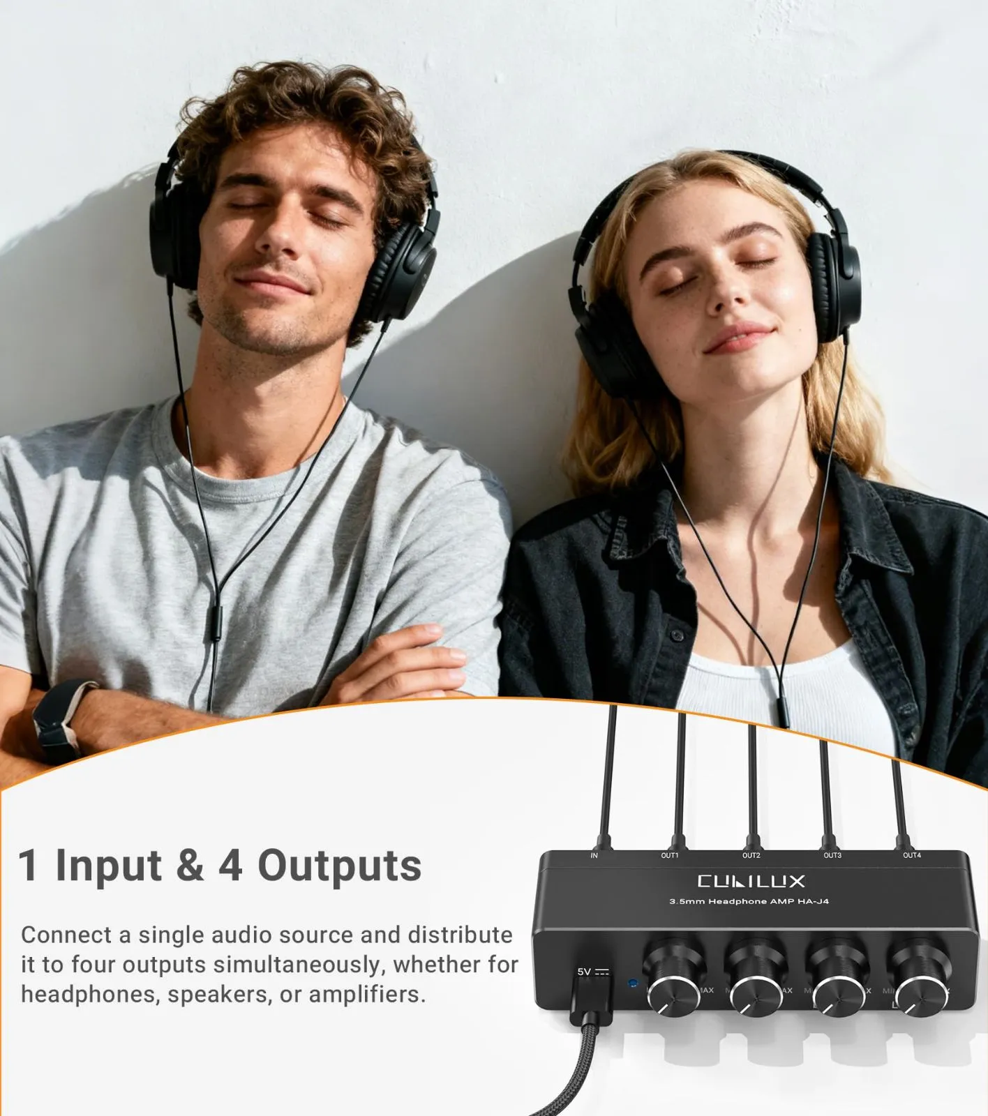 【4チャンネルヘッドフォンアンプ】Cubilux 3.5mmイヤフォンアンプは、他の人の邪魔をすることなく、同時に最大4人でオーディオを共有することができます。映画や音楽を楽しんだり、グループでのゲームや学習などに最適です。