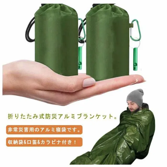 折りたたみ式防災アルミブランケット。非常災害用のアルミ寝袋です。収納袋 口笛 カラビナ付き!