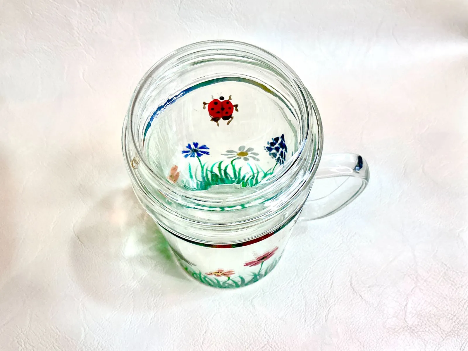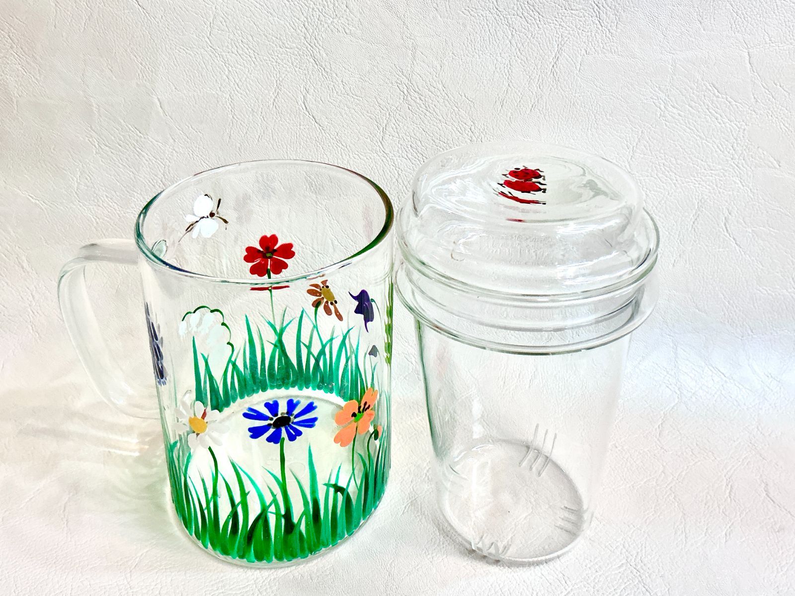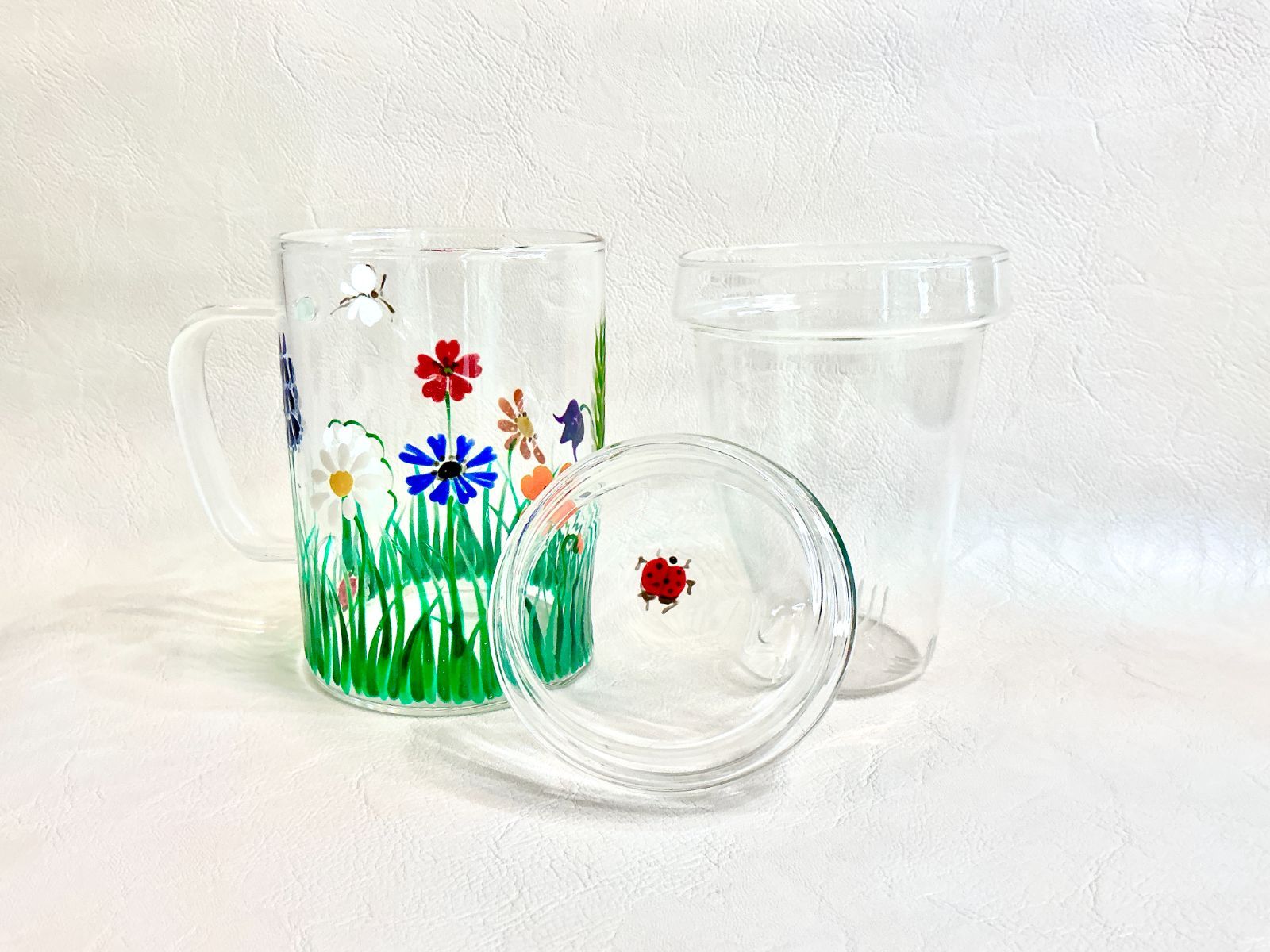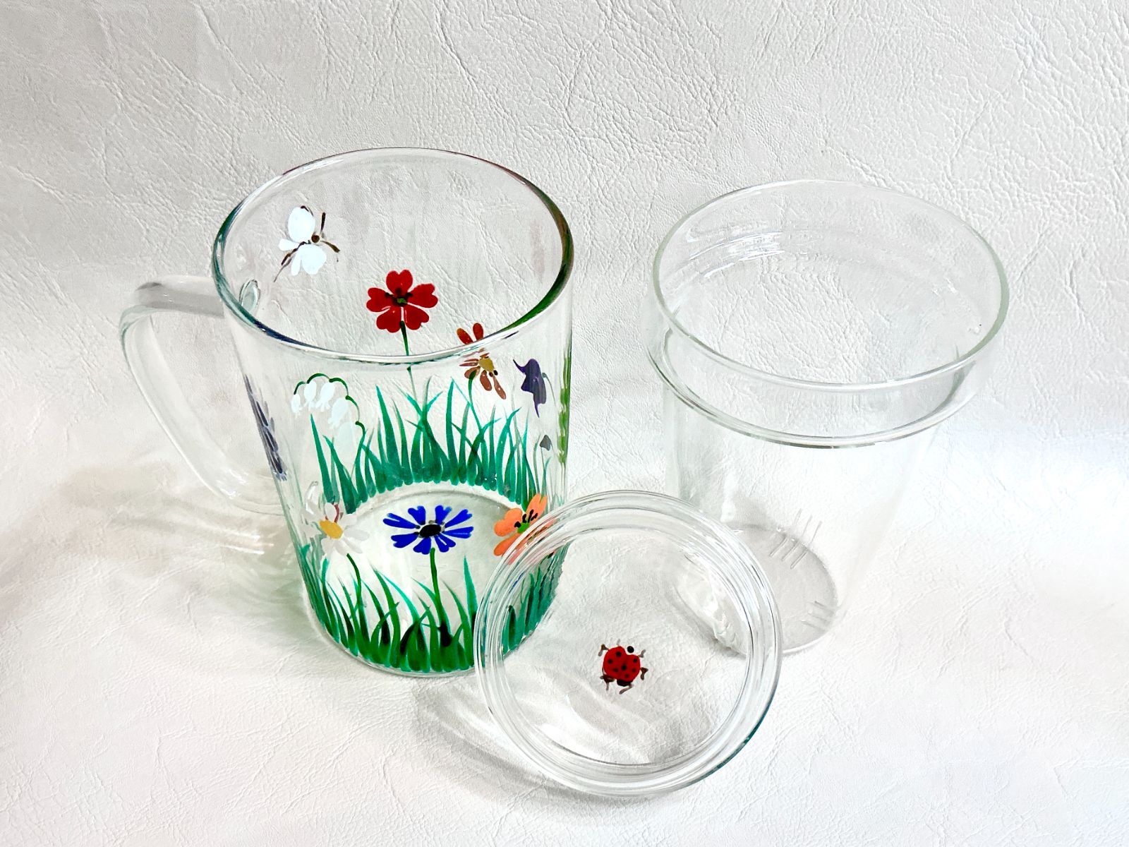 耐熱グラスマグ(フタ、茶こしつき。1個3役)【ドイツの草花】〘現品限り〙