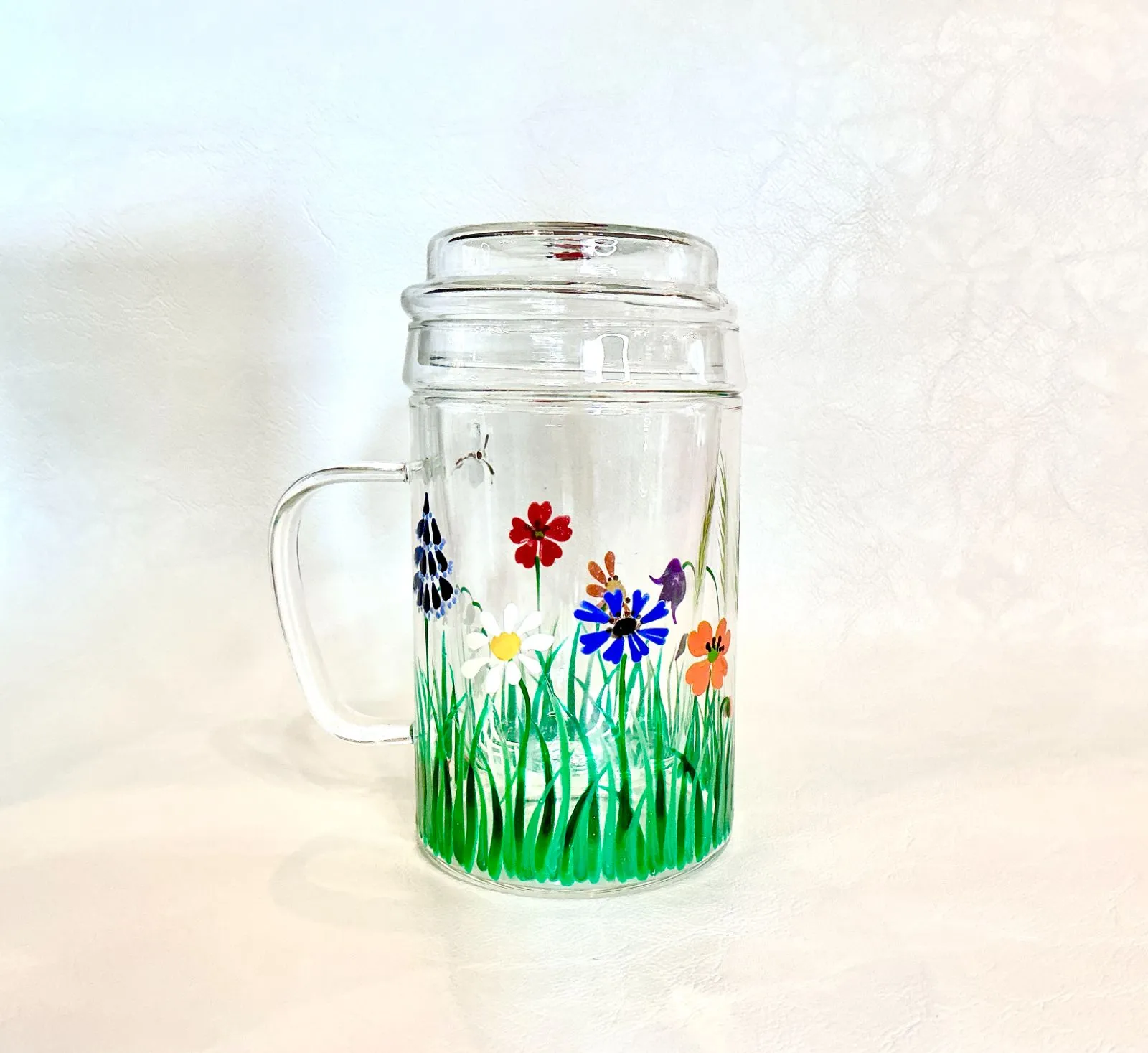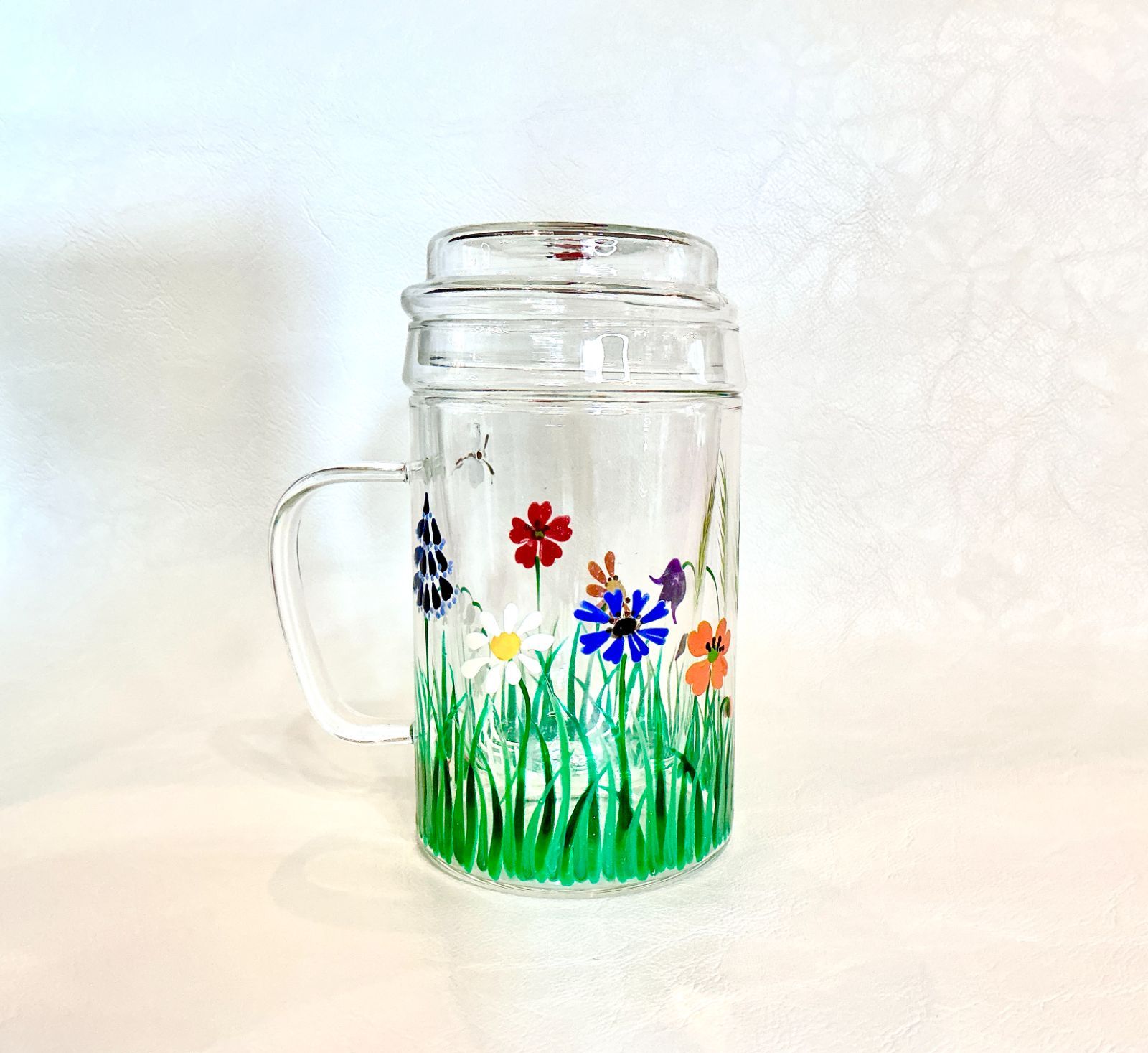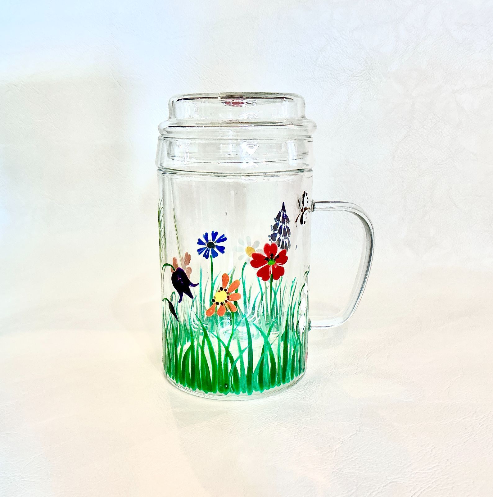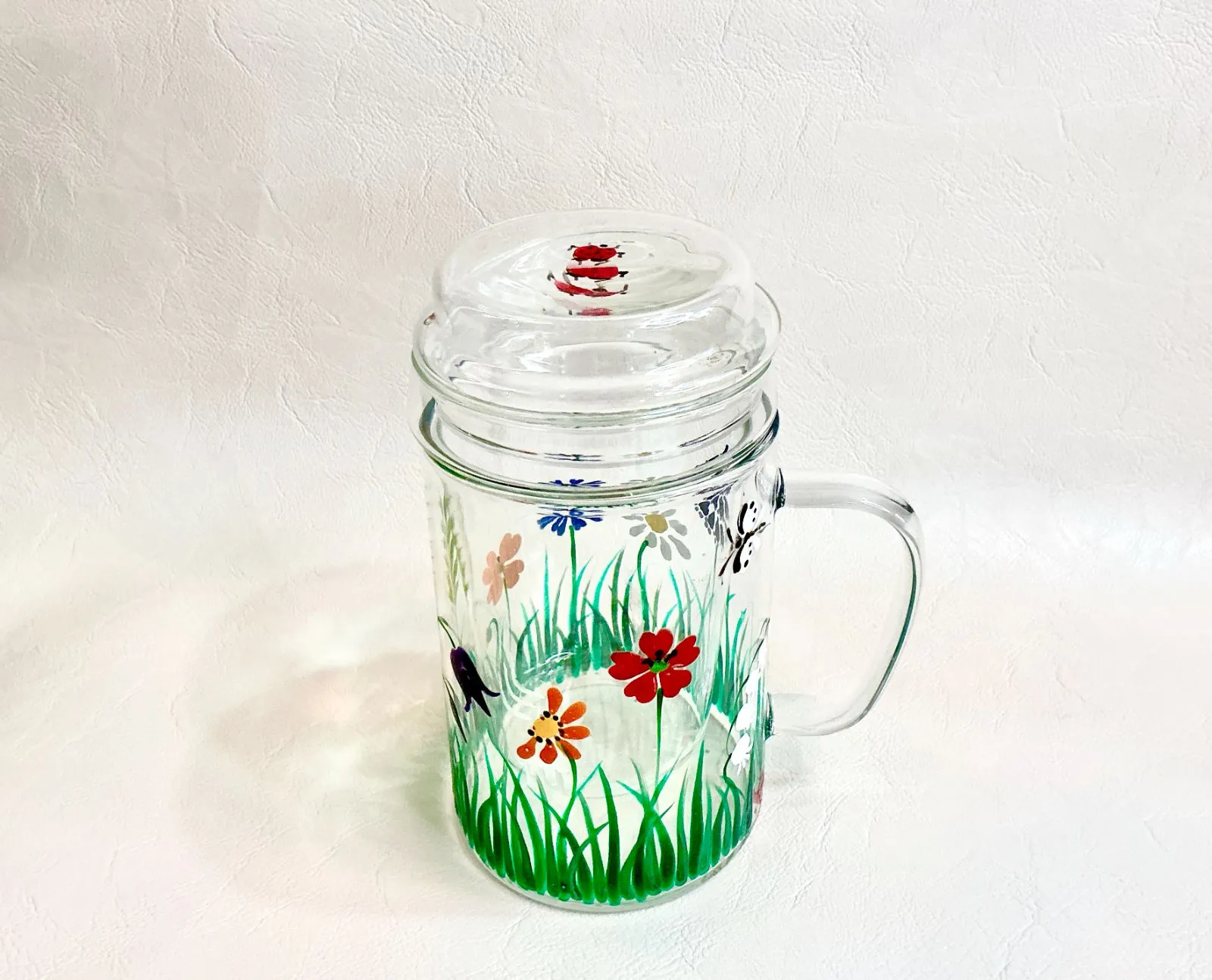 耐熱グラスマグ(フタ、茶こしつき。1個3役)【ドイツの草花】〘現品限り〙
