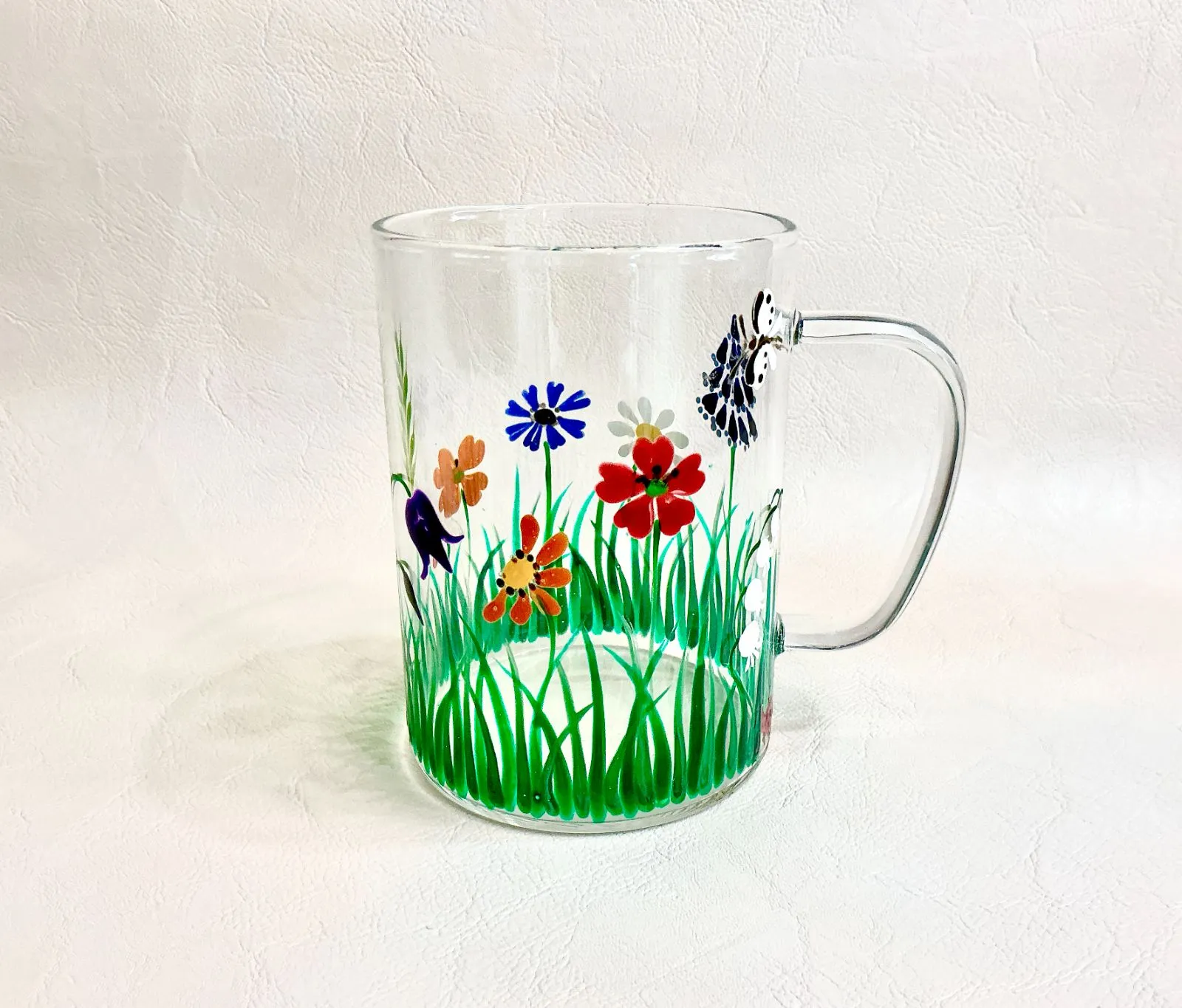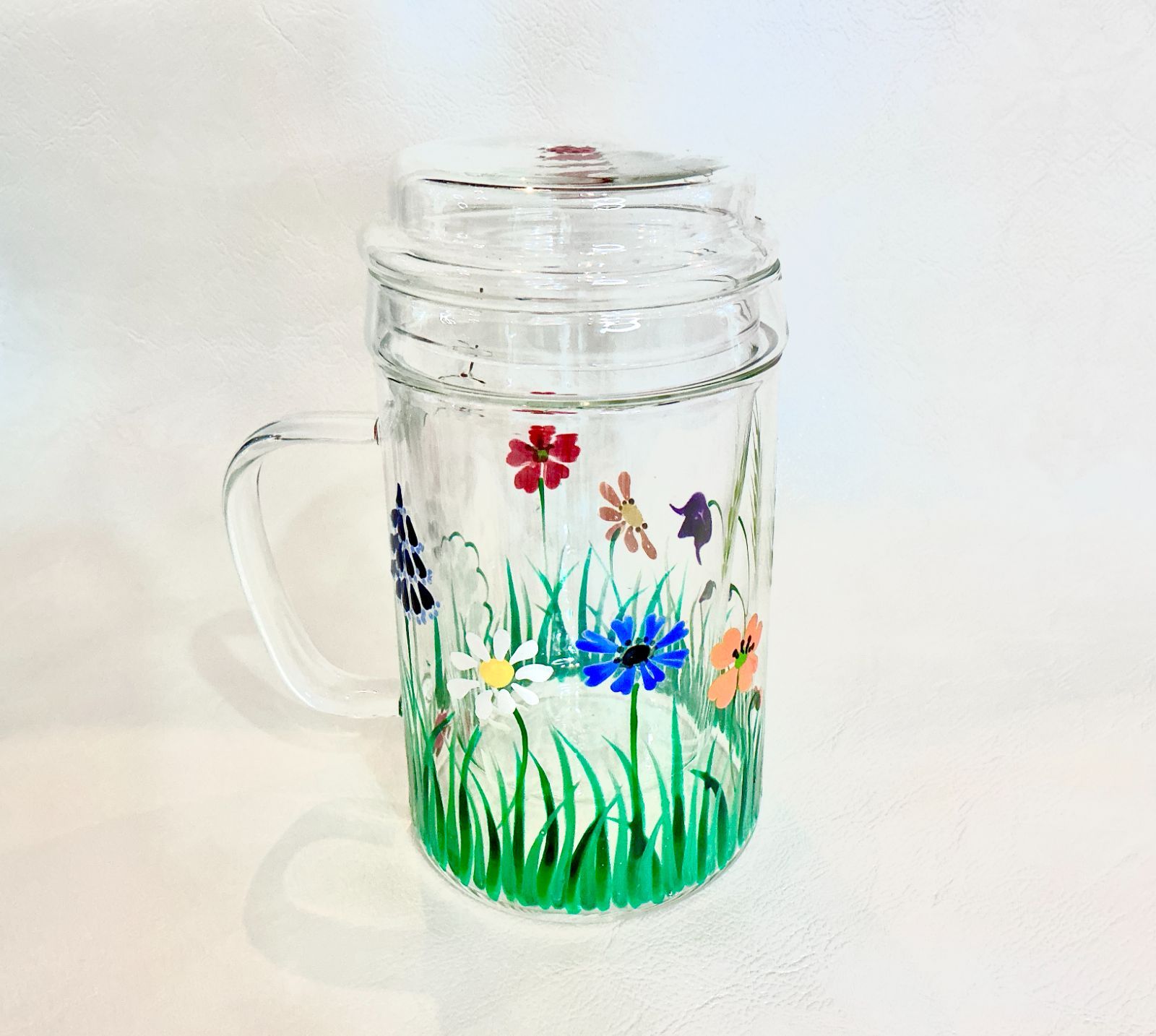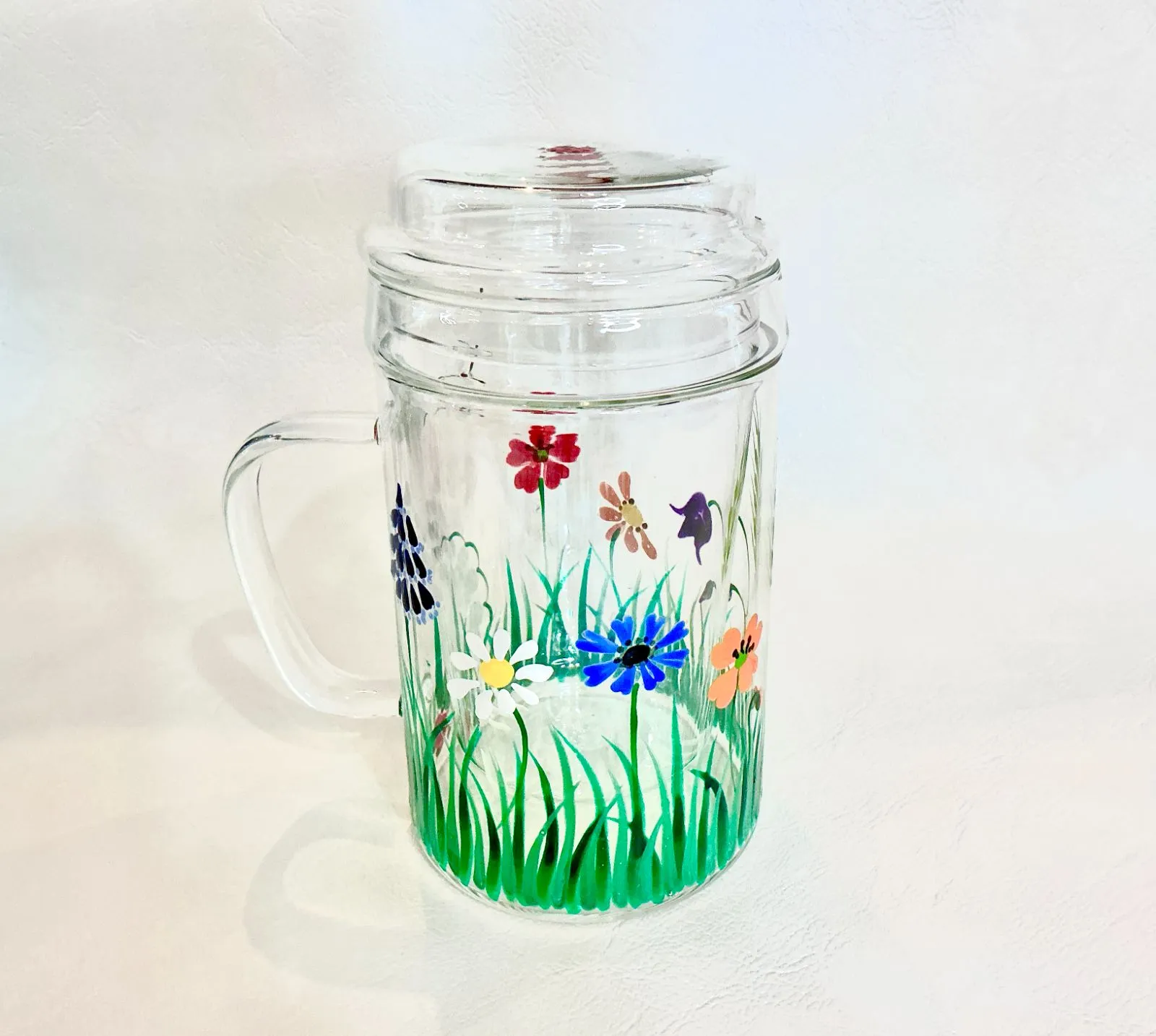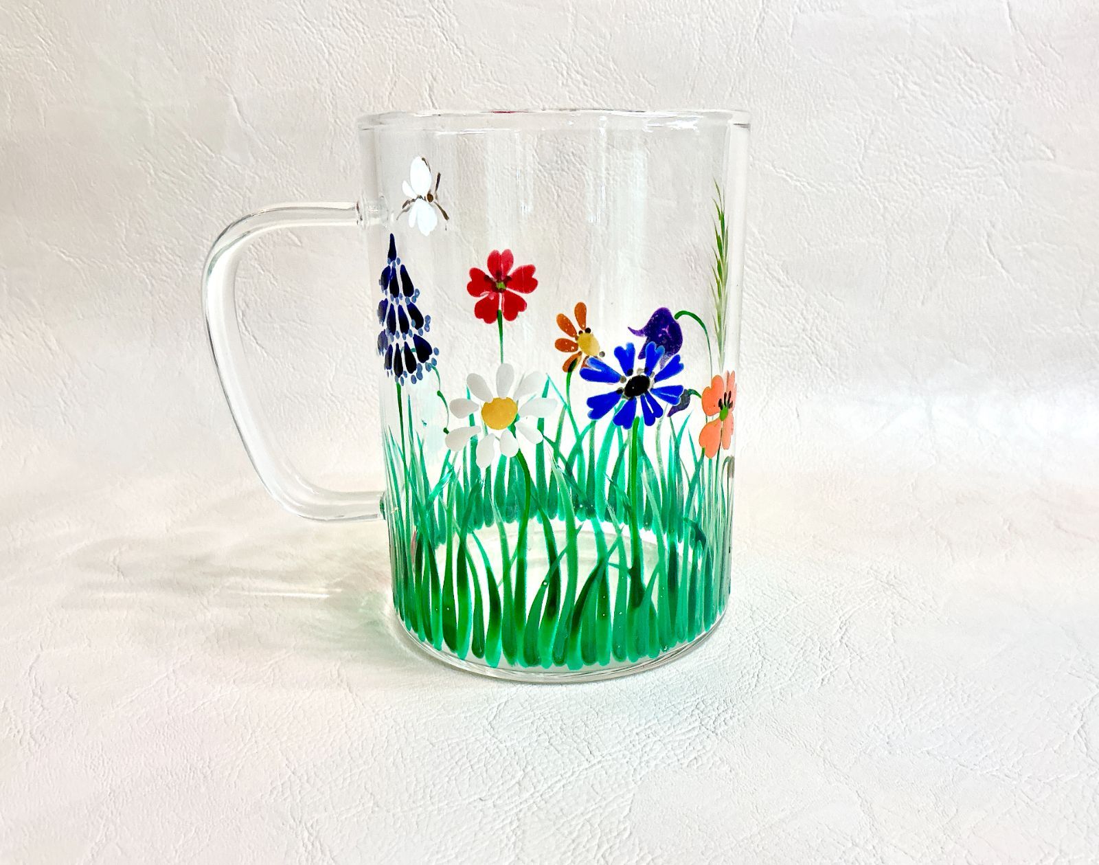 耐熱グラスマグ(フタ、茶こしつき。1個3役)【ドイツの草花】〘現品限り〙