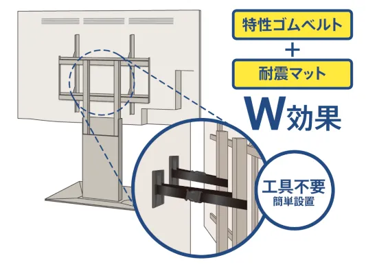 せっかくの壁寄せスタンドも、転倒しては大変です。特製ゴムベルトと耐震マットの「W効果」で、大切なテレビを守りませんか?