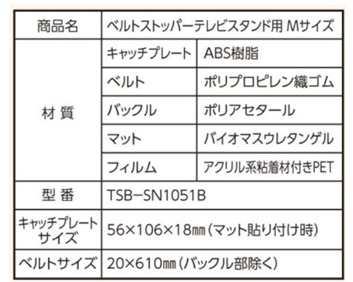 【商品仕様】 メーカー: プロセブン(Pro7) タイプ: 壁よせテレビスタンド用 状態: 新品・未使用 商品番号 TSB-SN1051B 商品名:ベルトストッパーテレビスタンド用Mサイズ 適応サイズ : ~50型まで(1個使用時) ※テレビ含む総重量20kgまで キャッチプレートサイズ : 56×106 x18mm(マット貼り付け時) ベルトサイズ:20 x 610(バックル部除く) 使用マットサイズ:50ⅹ100xt5mm 入数:1セット1個入 セット内容:キャッチプレート1個 バックル付きベルト1個 マット1枚 壁紙補強フィルム1枚 設置日シール1枚
