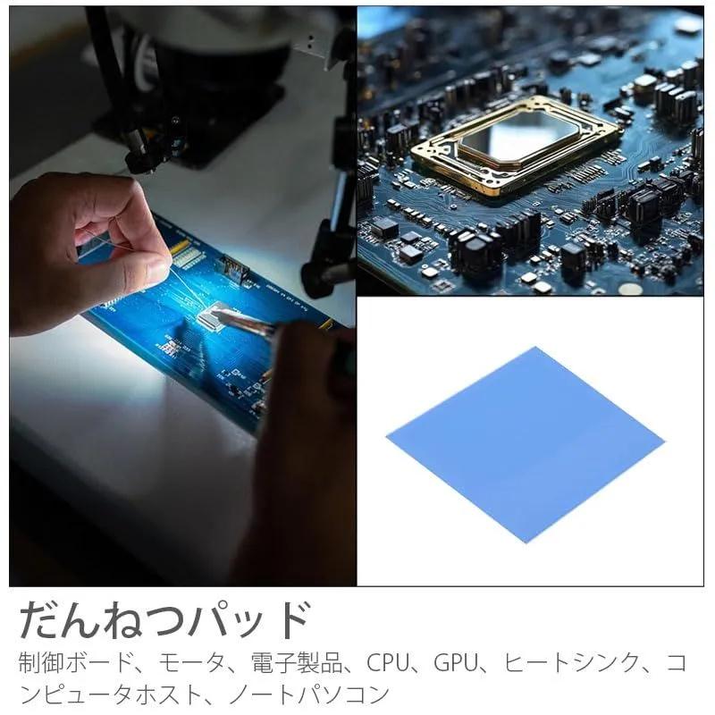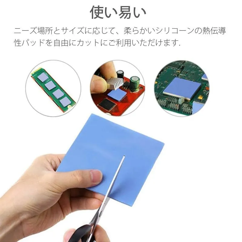 【自由にカット】ニーズシーンによって、シリコーンの熱伝導性パッドを自由にカットにご利用いただけます。 製品仕様:ソフトシリコンサーマルパッド5枚入、1枚サイズ:100mm x 100mm x 0.5 mm(L x W x T)、熱伝導率: 1.5 w/m-K、 耐熱温度: 50~200(℃)、カラー: ブルー。 最後までご確認頂き誠にありがとうございました。 上記をご確認頂き、ご購入いただけましたら幸いです。 何かご不明な点がございましたらお気軽にメッセージからお問い合わせ下さい。