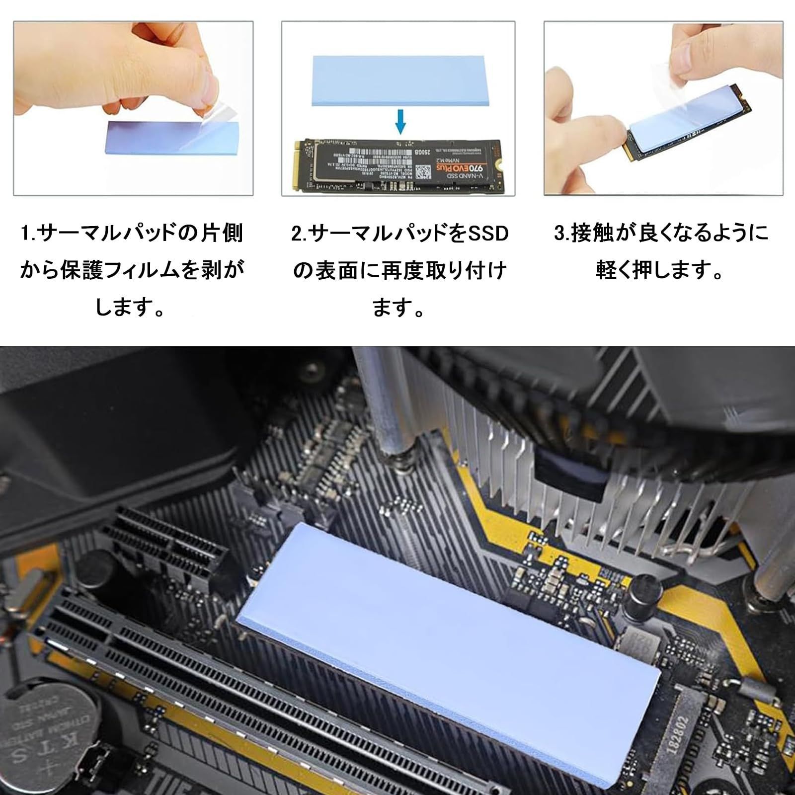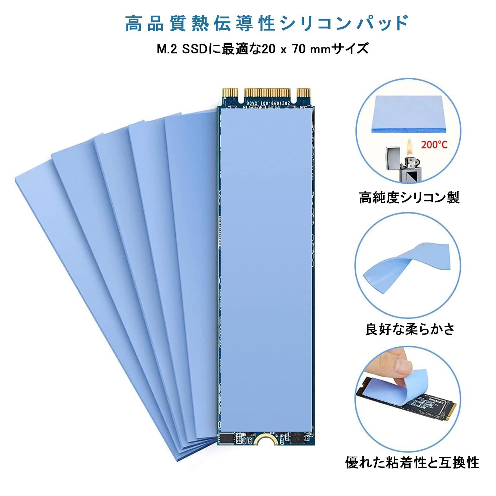 【超強熱伝導性能】このハードディスク導熱シリコンパッドは高品質のシリコン素材を採用し、熱伝導率が3.0 W/mkに達し、M.2 SSDが発生させる熱を迅速にヒートシンクに伝導し、ハードディスクが常に良好な作業状態を維持し、ハードディスクの性能を向上させます。