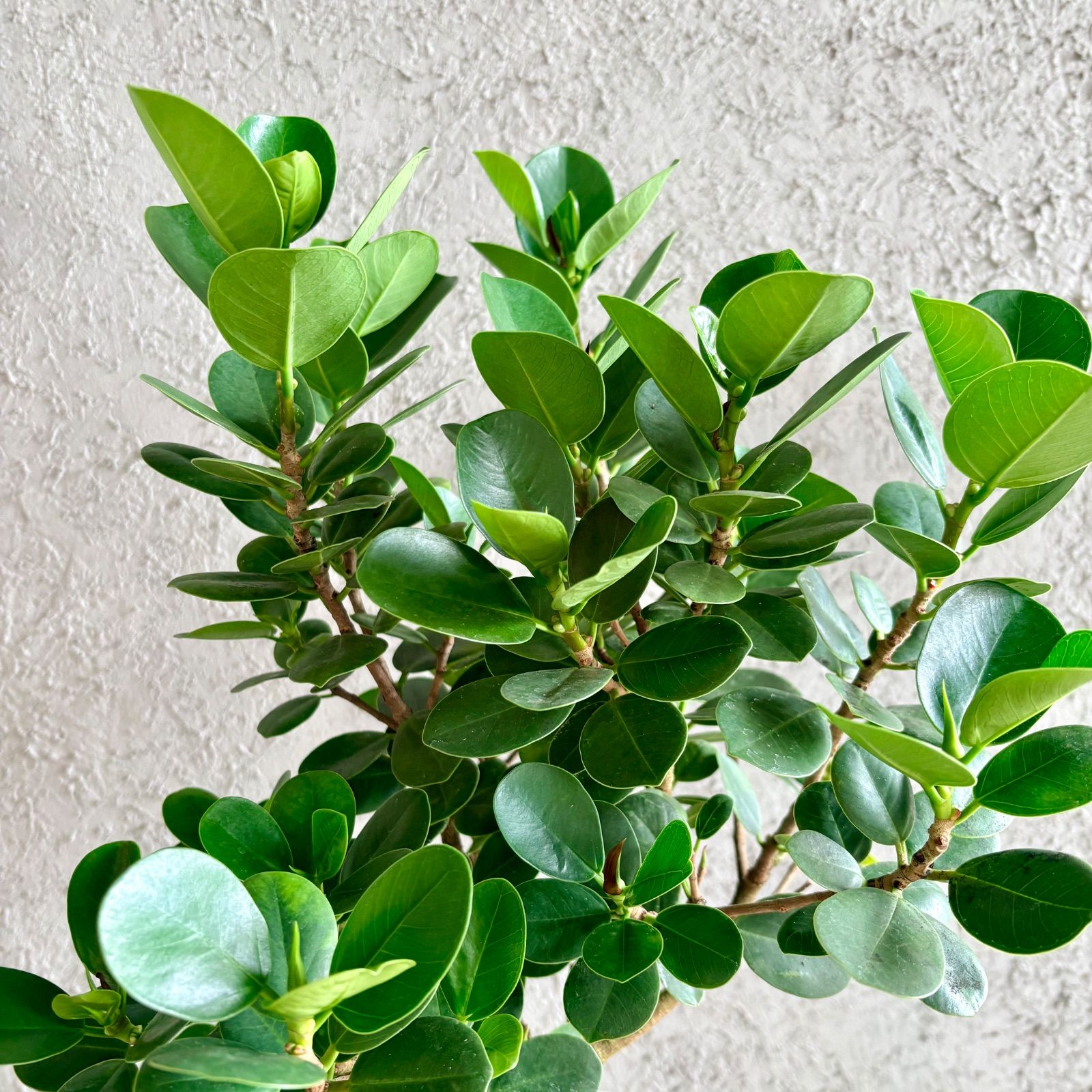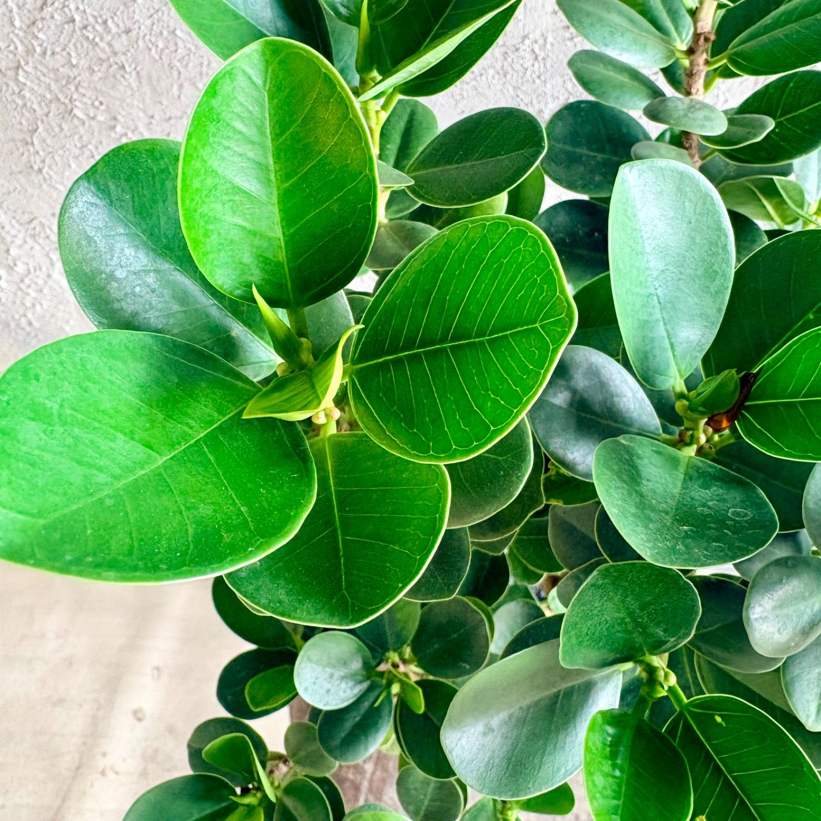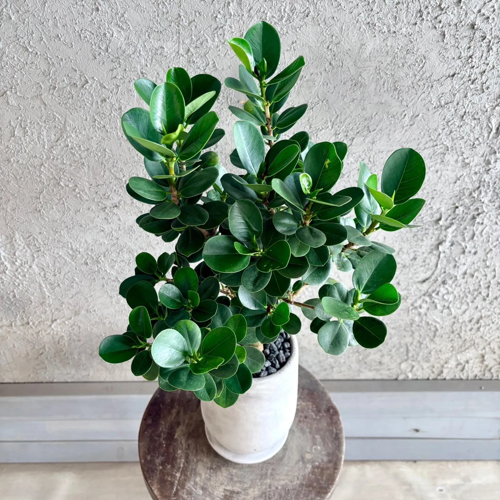 【植物について】 パンダガジュマルは生産過程で突然変異してできた品種で、ガジュマルの中でも特に珍しい品種です。通常のガジュマルより丸く肉厚な葉が特徴的で、成長が遅く幹が太くなりにくいため大きく育てるには時間がかかります。
