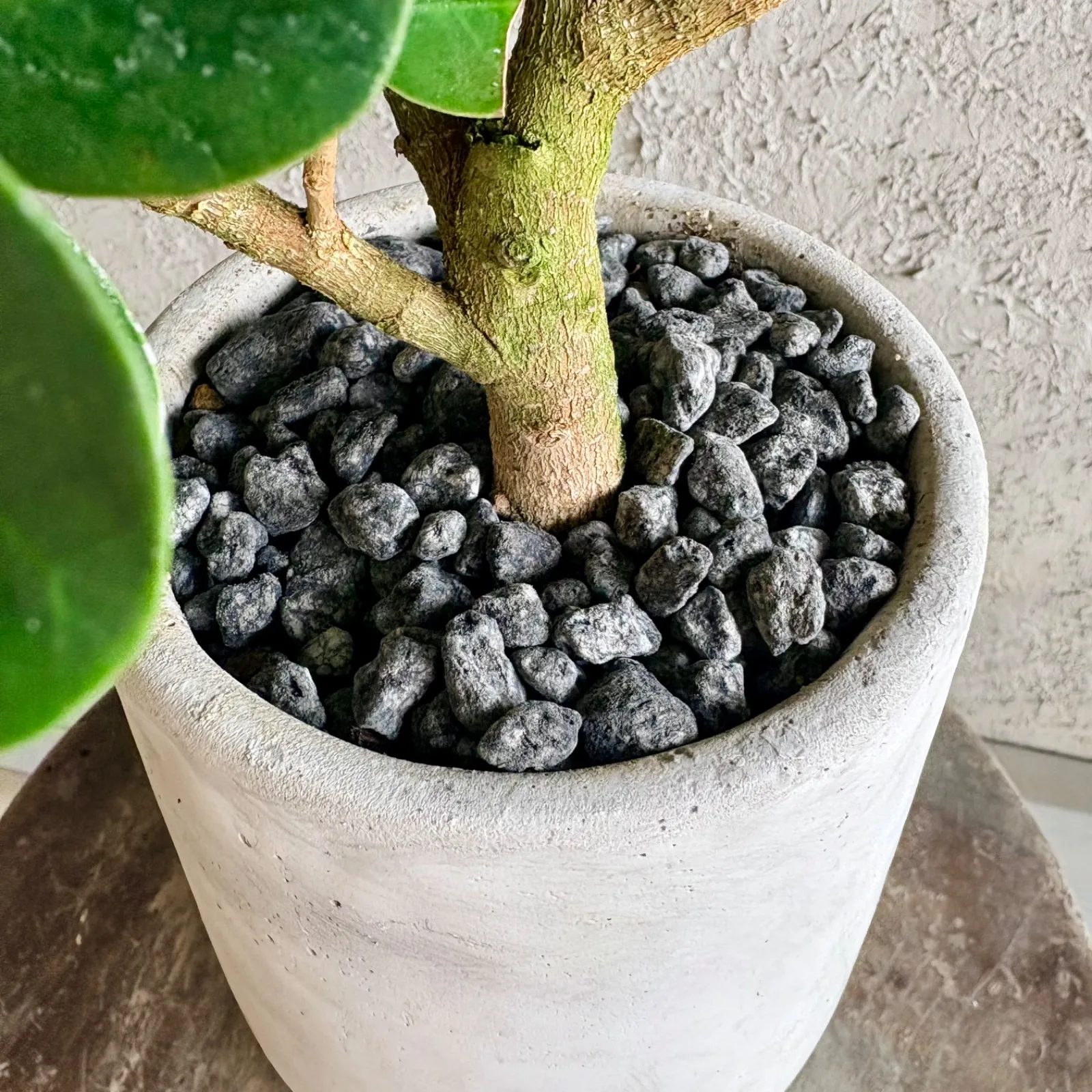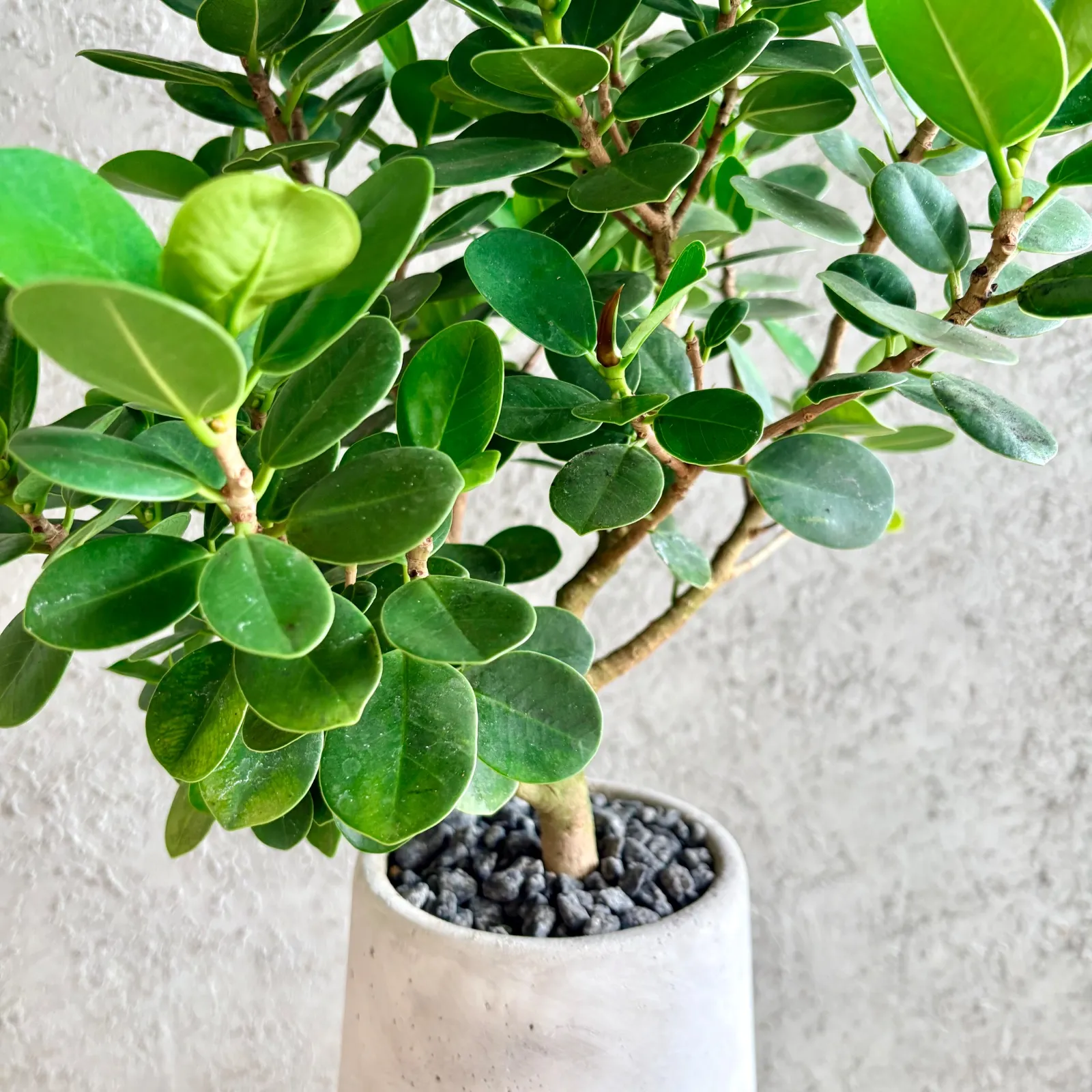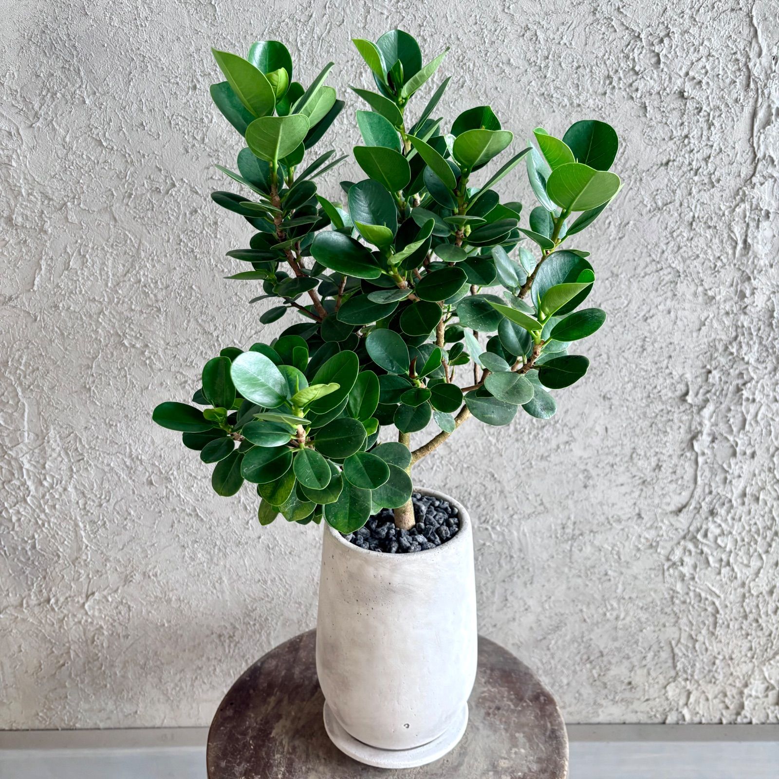 【植物について】 パンダガジュマルは生産過程で突然変異してできた品種で、ガジュマルの中でも特に珍しい品種です。通常のガジュマルより丸く肉厚な葉が特徴的で、成長が遅く幹が太くなりにくいため大きく育てるには時間がかかります。