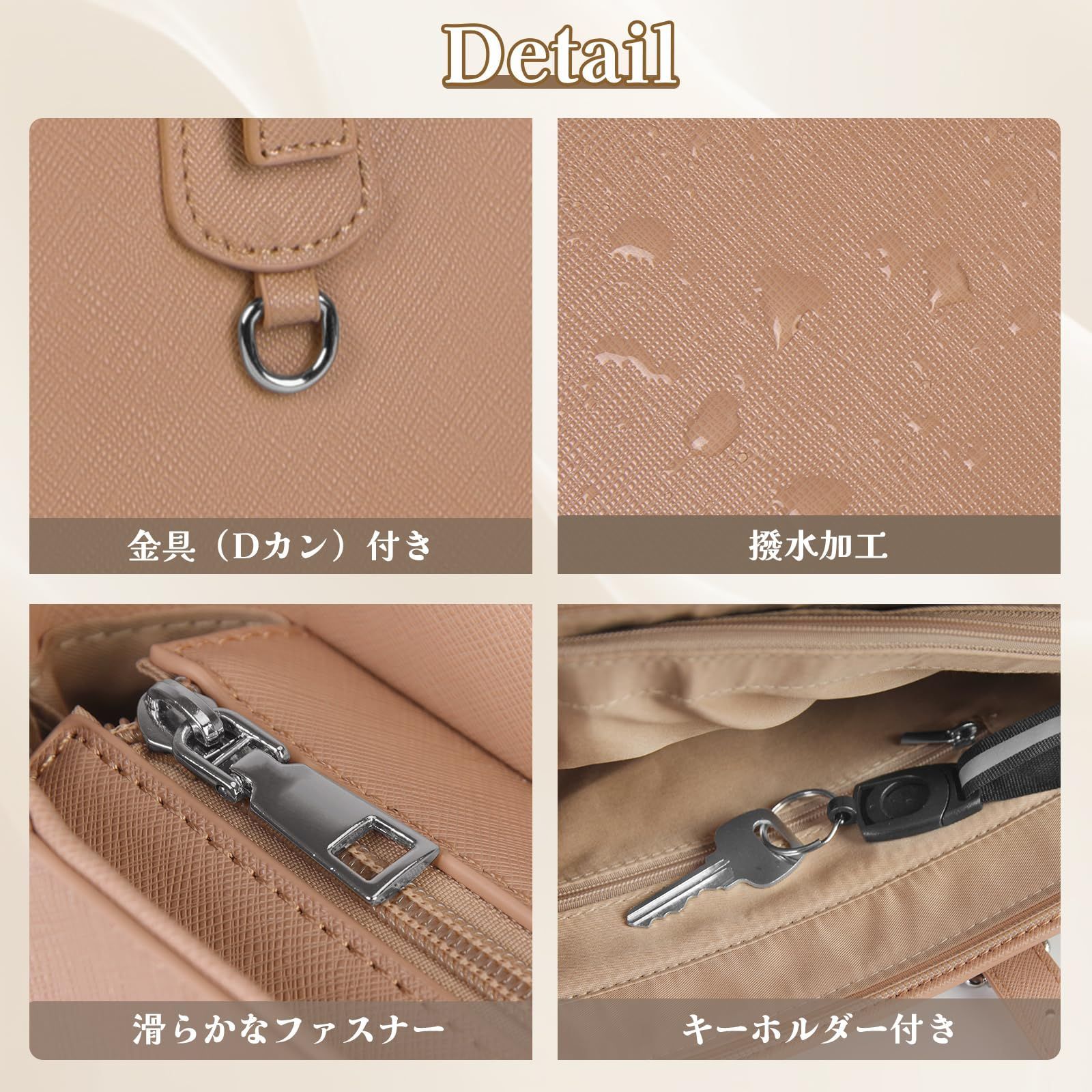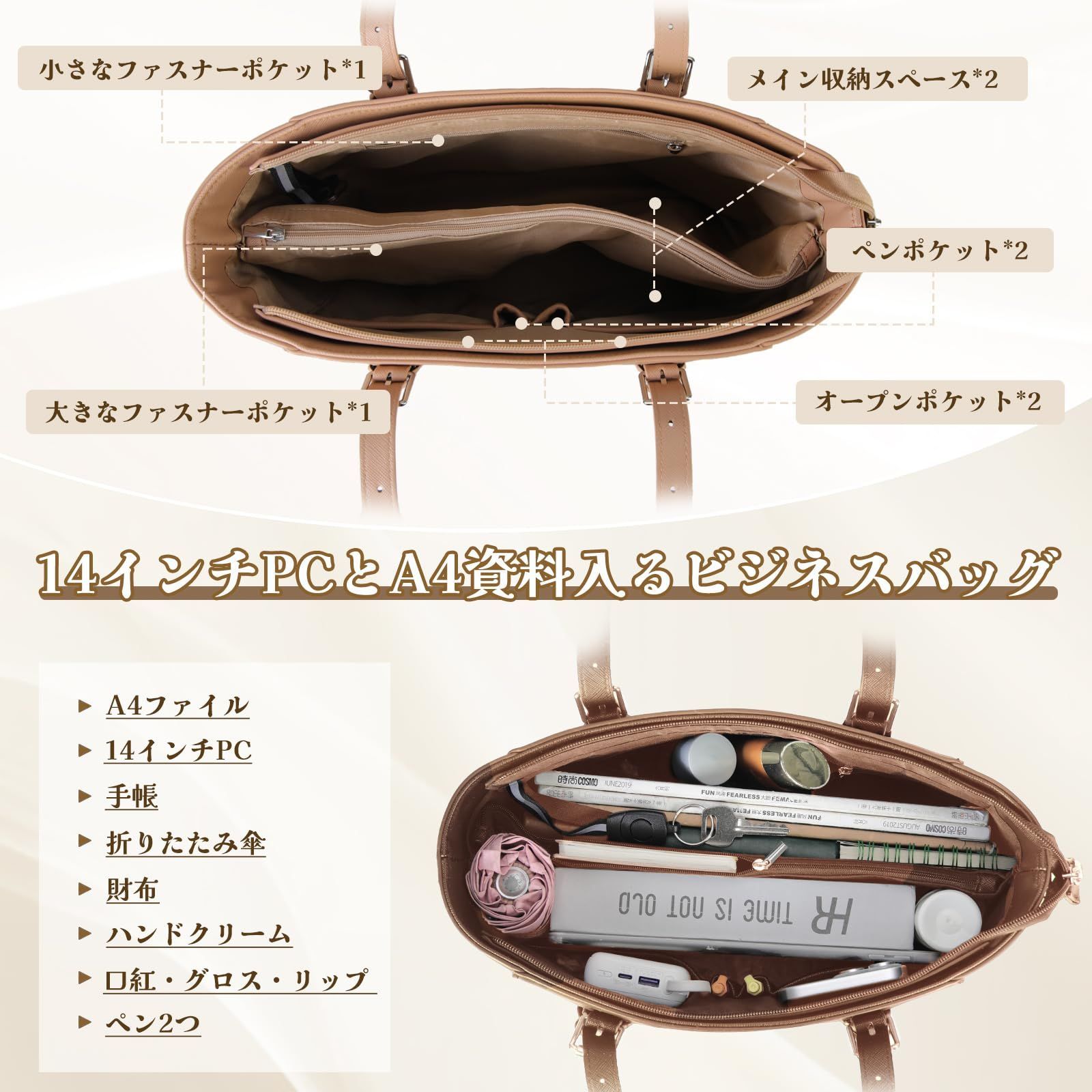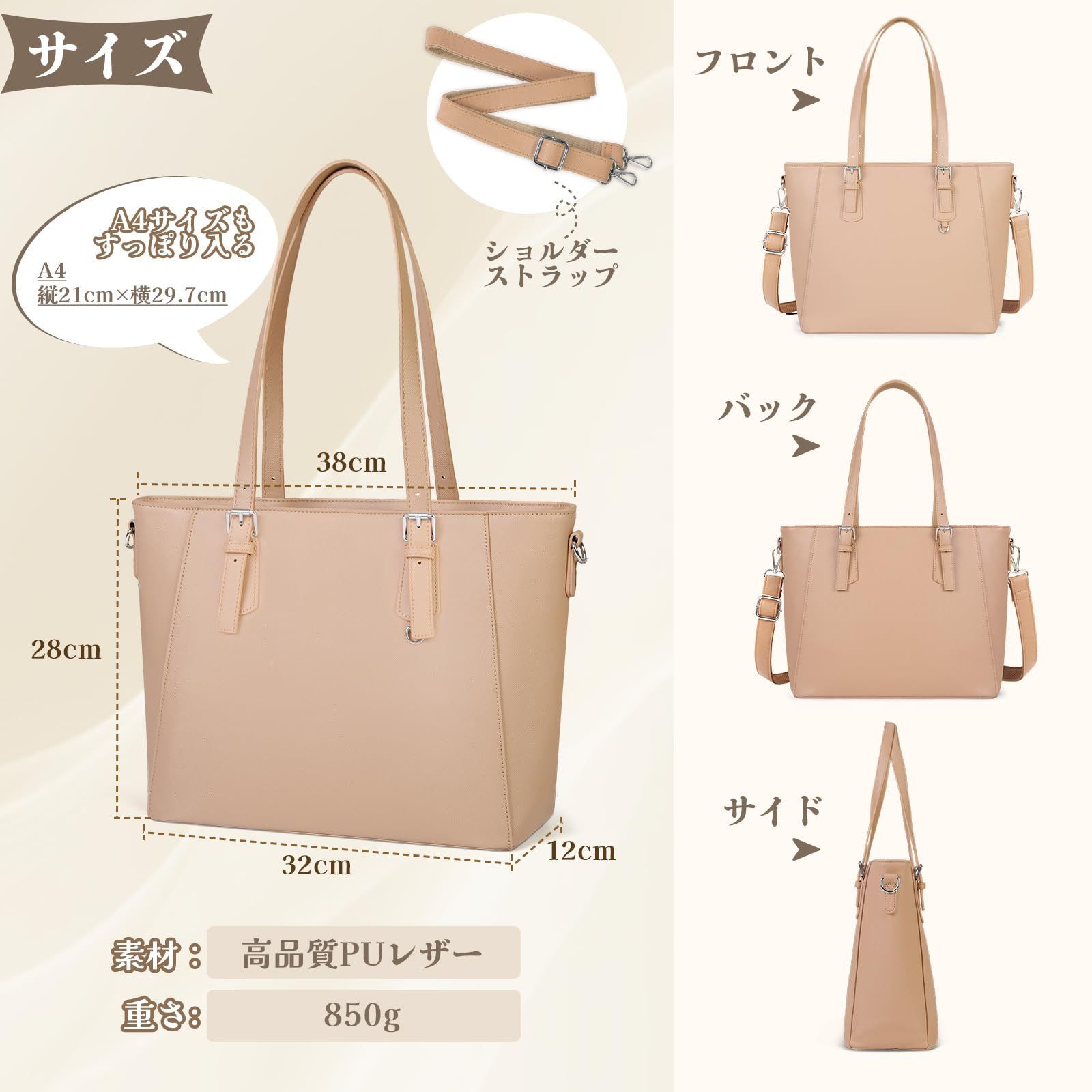 【調節可能な取っ手&自立機能】持ち手の長さは3段階に調整可能で、ニーズに応じて、長さが変更できます。さらにバッグの底に鋲が4つ付いております。直置きでも傷や汚れからバッグを守ります。通勤やビジネスはもちろん、オフィス外での商談や打ち合わせなどの際にも床に立てられて置き場所に困らず、商談や仕事の邪魔にならず、仕事に集中できる自立式のレディースバッグです。