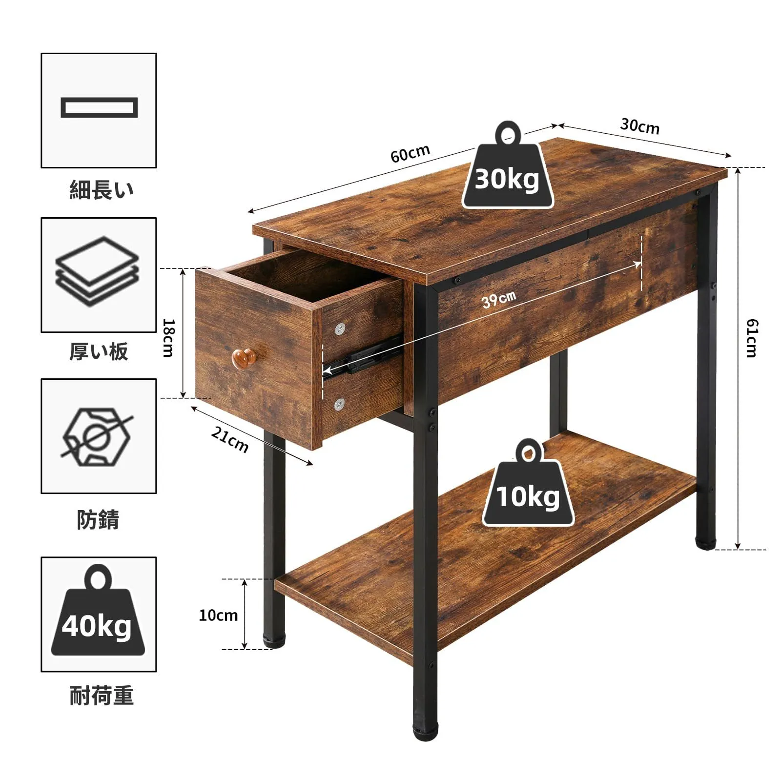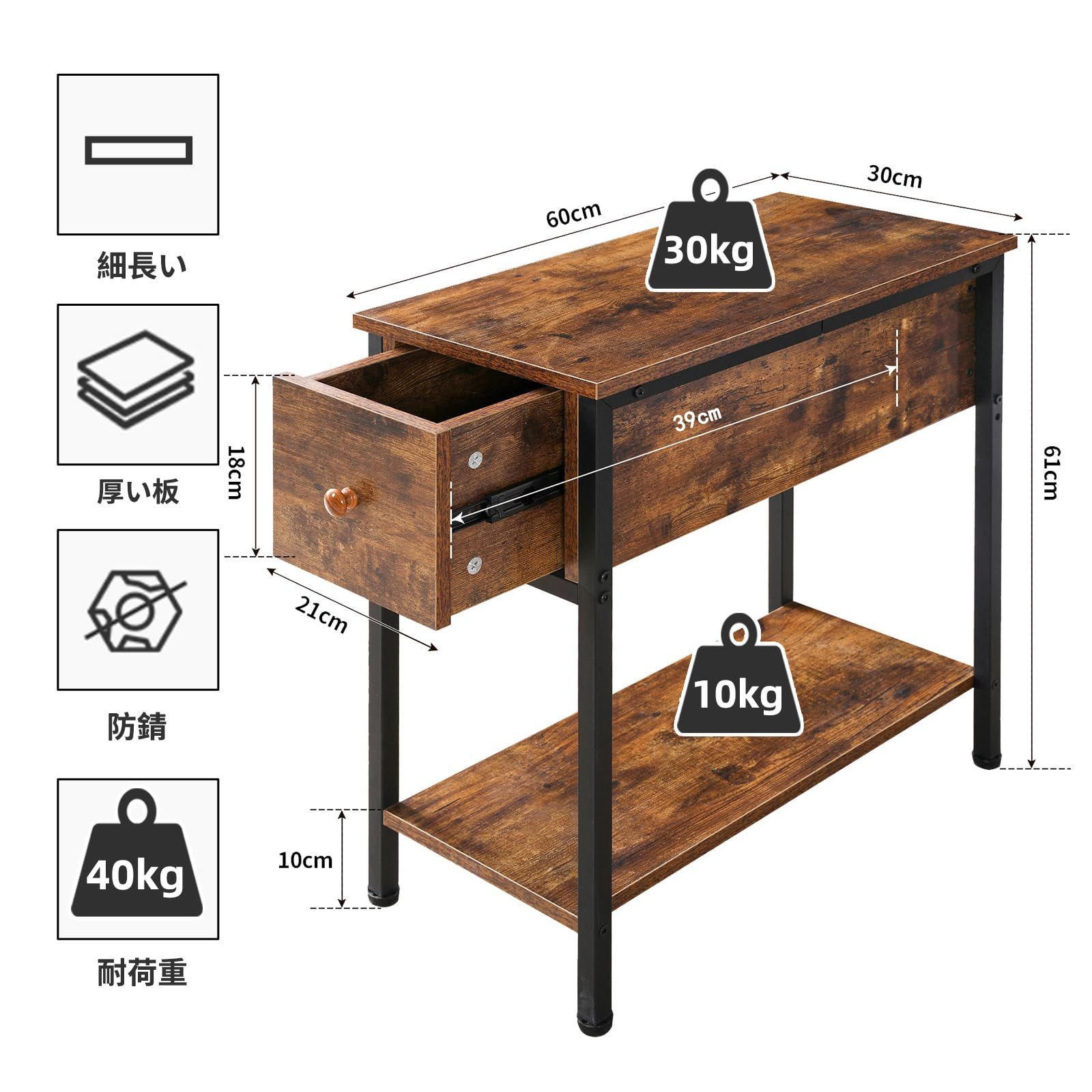 狭いスペースに最適: サイドテーブルのサイズは幅60奥行30高さ60cmです。このスリムなサイドテーブルは、リクライニングチェアの間の狭いスペースや、ソファやベッド横の狭い隙間に簡単に収まります。ヴィンテージな設計が、リビングルーム、寝室、または必要な場所に魅力を加えます