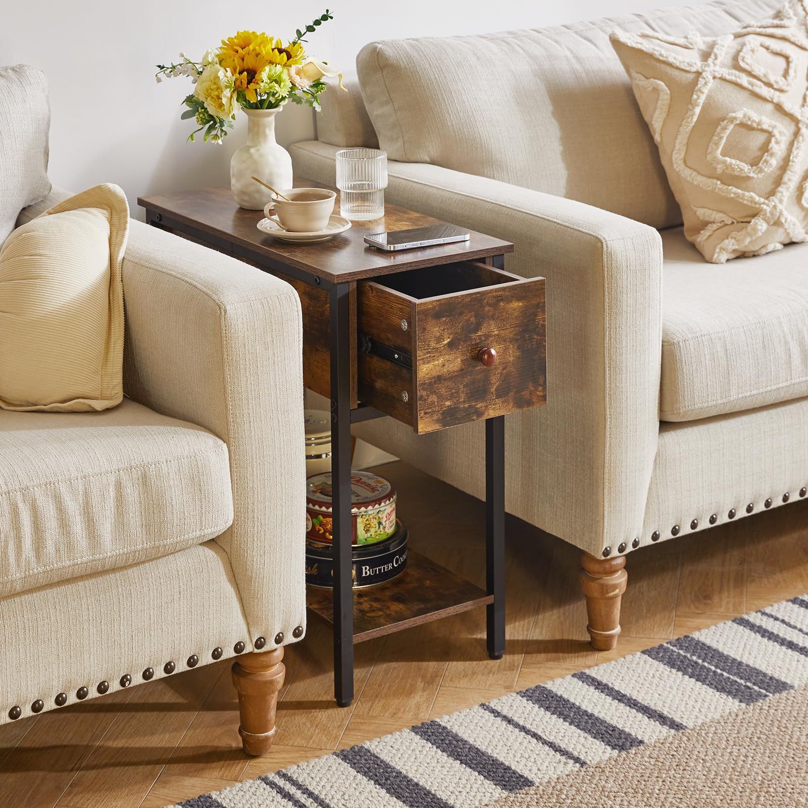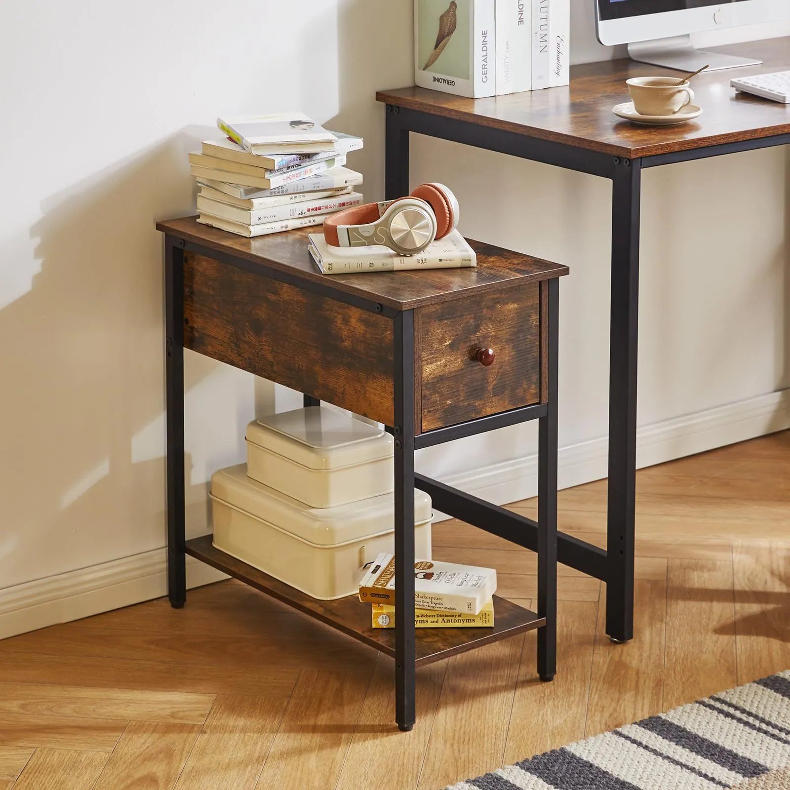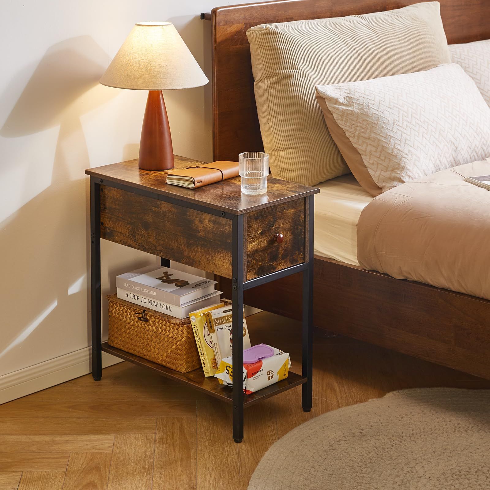 使いやすい: この細長いサイドテーブルは、単なる収納スペース以上のものです。引き出し付きのナイトテーブルは、リモコン、コントローラー、充電器のコードを整理するのに最適です。引き出しの下には、他の必需品を収納できる十分なスペースのあるオープンシェルフがあります