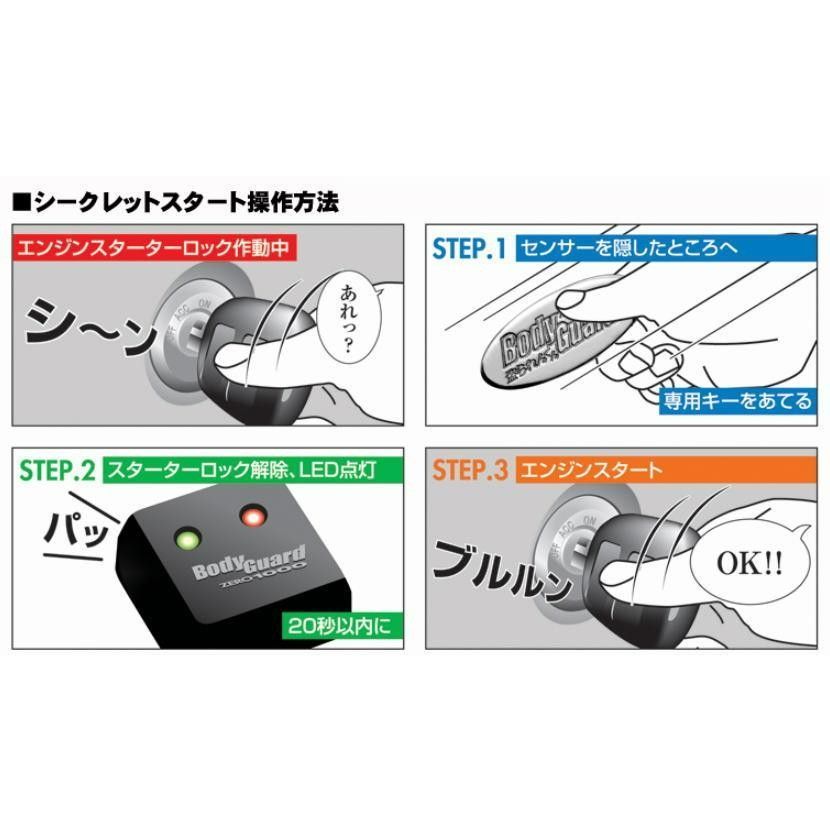 ●常時電源、イグニッション、スターターの各信号線への割り込み接続とマイナスアース線の接続だけで、ちょっと変わったスターターロック機能を実現すれば、サイレントタイプの簡易セキュリティ兼用となりますのでDIYユーザーにもおすすめです。 メーカー名:(株)ZERO-1000