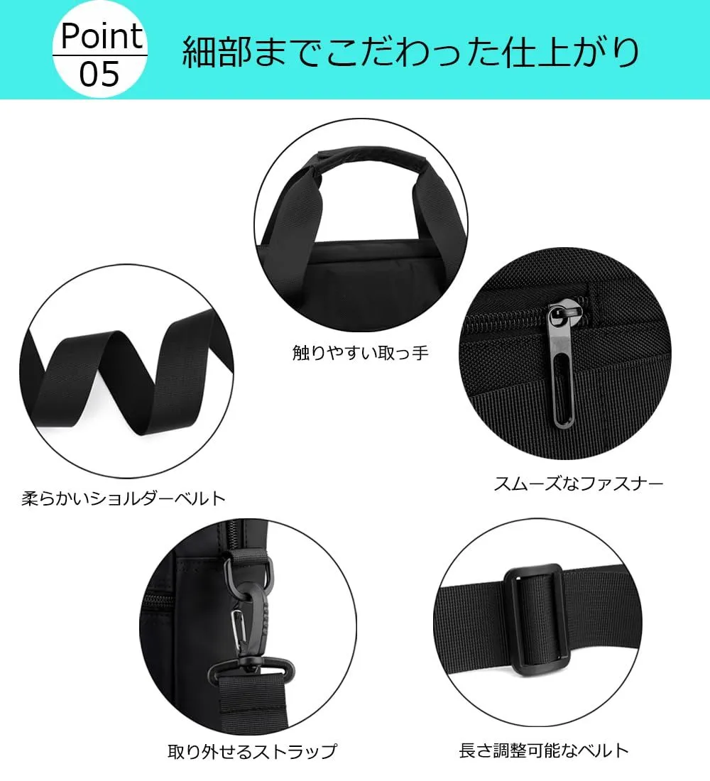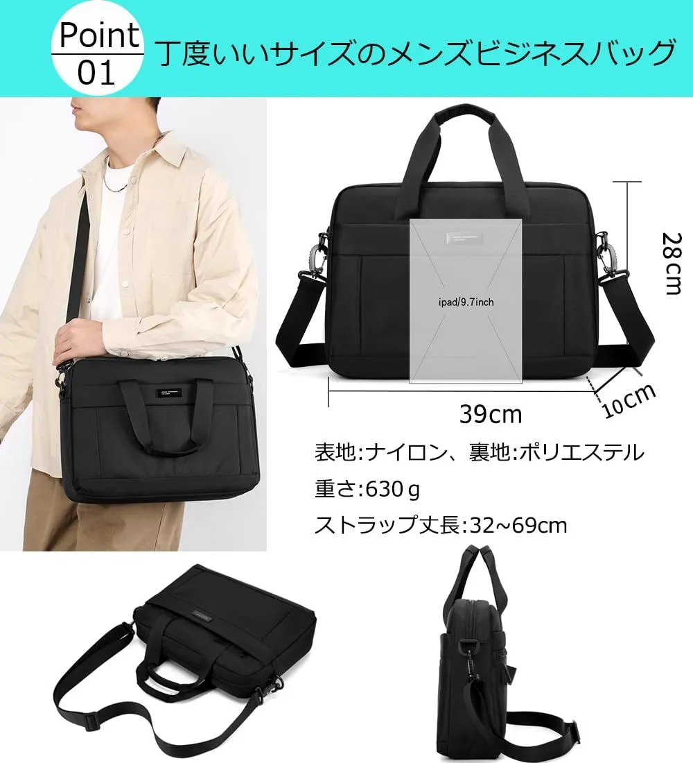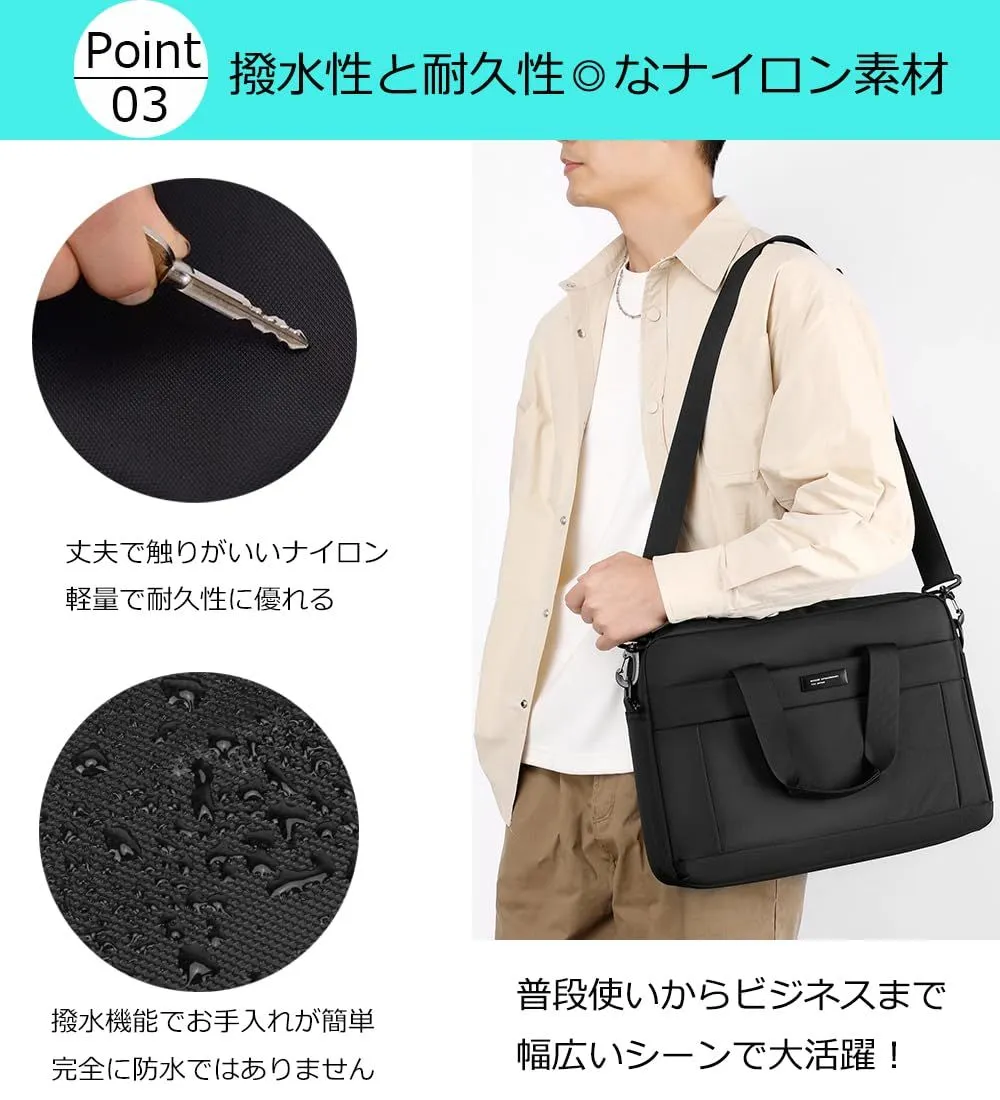 【軽くて丈夫なナイロンバッグ】このメンズビジネスバッグはナイロン生地で作られているので、肌触りもよく、型崩れしにくいです。水を弾き、汚れが付いてもサッと拭くだけで汚れが取れます。丈夫でお手入れも簡単。また、肩に負担のかからない軽いカバン(約630g)なので、鞄選びに軽さも重視したい人におすすめ。