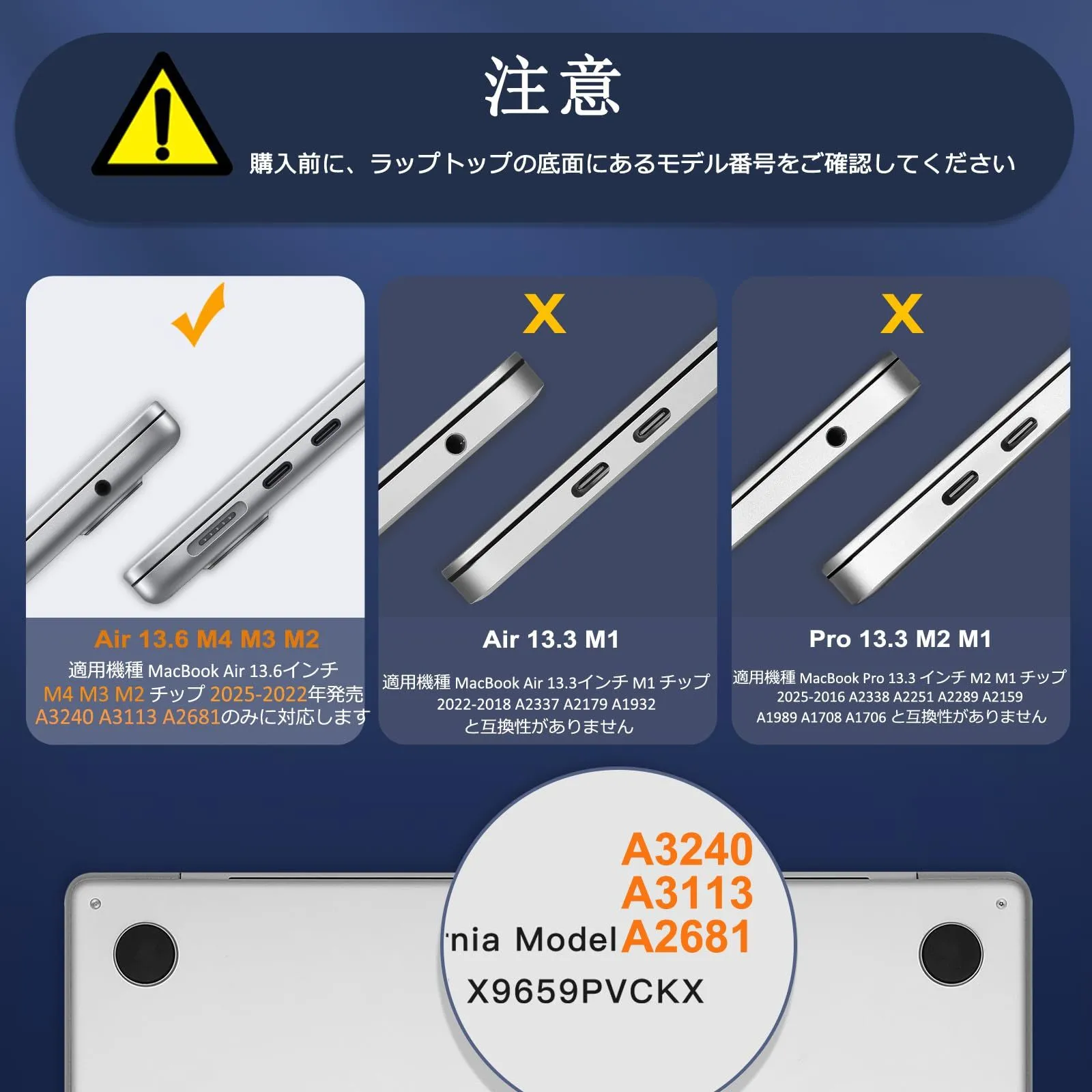 購入前に、ラップトップの底面にあるモデル番号「Axxxx」をご確認してください。「A3240」、「A3113」、「A2681」と記載されているリストのタイトルとまったく同じモデル番号を選択してください。