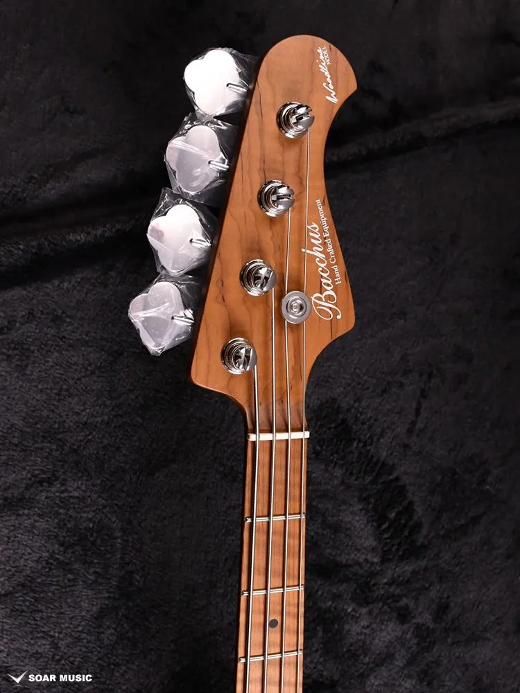 ローステッドメイプルとはメイプルを高温で加熱処理して材の中の水分や油分を揮発させることにより剛性を高めた材。ネックに使用されるとその効果は安定性だけでなくサウンドにも及び、豊かな生鳴りと経年変化したビンテージのようなこなれたトーンを生み出します。高級機種で使われることの多いこの本格派仕様をリーズナブルな価格帯に落とし込んだBacchusの新しい製品ラインナップです。