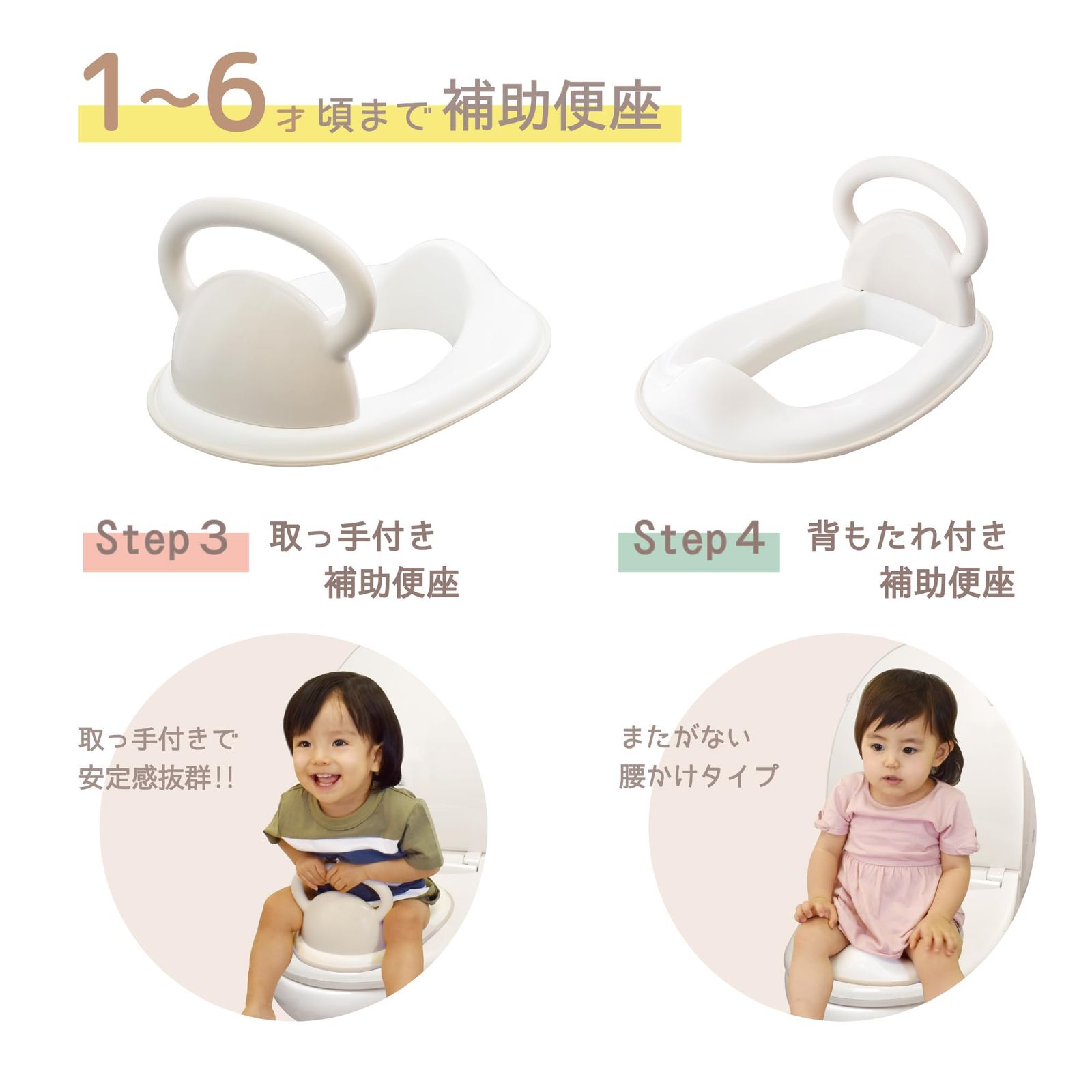 STEP2 補助便座として(1才6ヶ月頃から6才頃まで)。 取っ手付き補助便座、腰かけタイプ補助便座と2通りの使い方が出来ます。取っ手を外して取っ手なしタイプでもご使用頂けます。