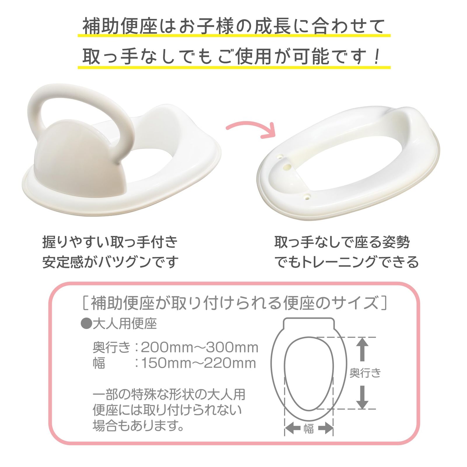・取っ手付き補助便座、腰かけタイプ補助便座と2通りの使い方が出来ます。取っ手を外して取っ手なしタイプでもご使用頂けます。
