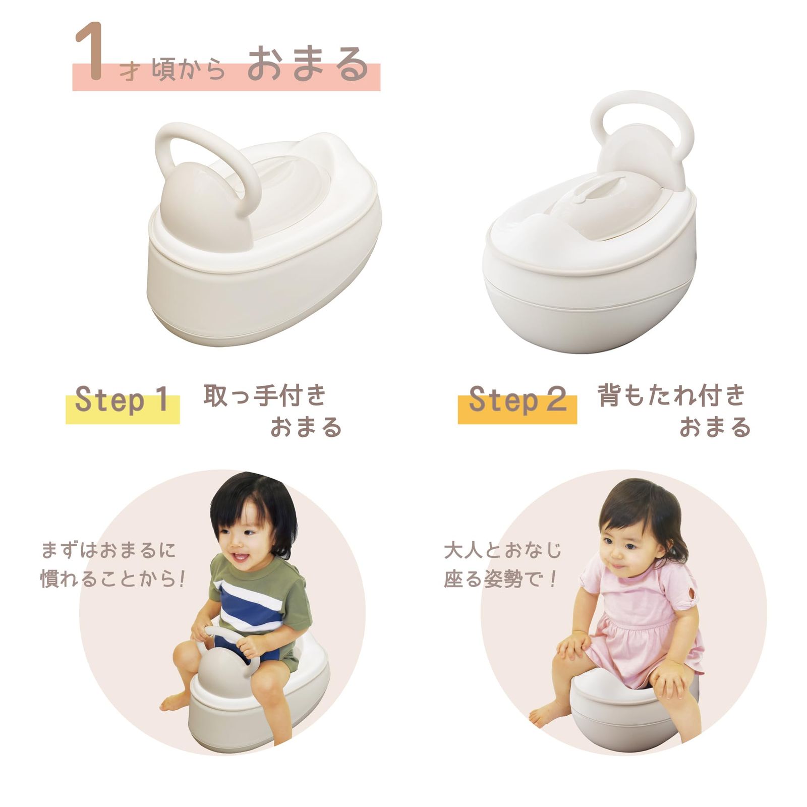 STEP1 おまるとして(1才頃から)。 取っ手付きおまる、背もたれ付きおまると2通りの使い方が出来ます。