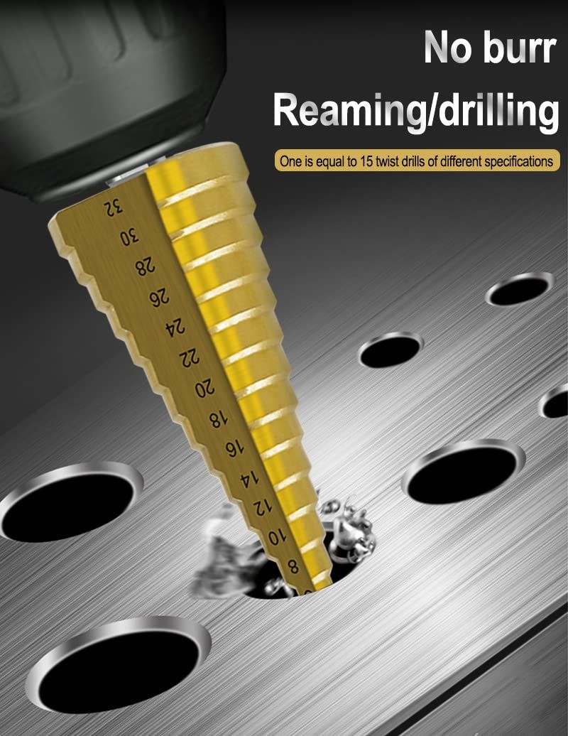 【6本セットステップドリル】1つのドリルで様々な大きさの穴を開けられる便利アイテムです.複数の穴径に対応できるため、多様な穴径が必要な場合でも複数のドリルを用意する必要がなくなり作業効率が向上します。また鋭い先端部分が素材を切削するため、加工時の振動やバリの発生が少なく、仕上がりが良好です。これにより作業時間の短縮が可能となります。 ?