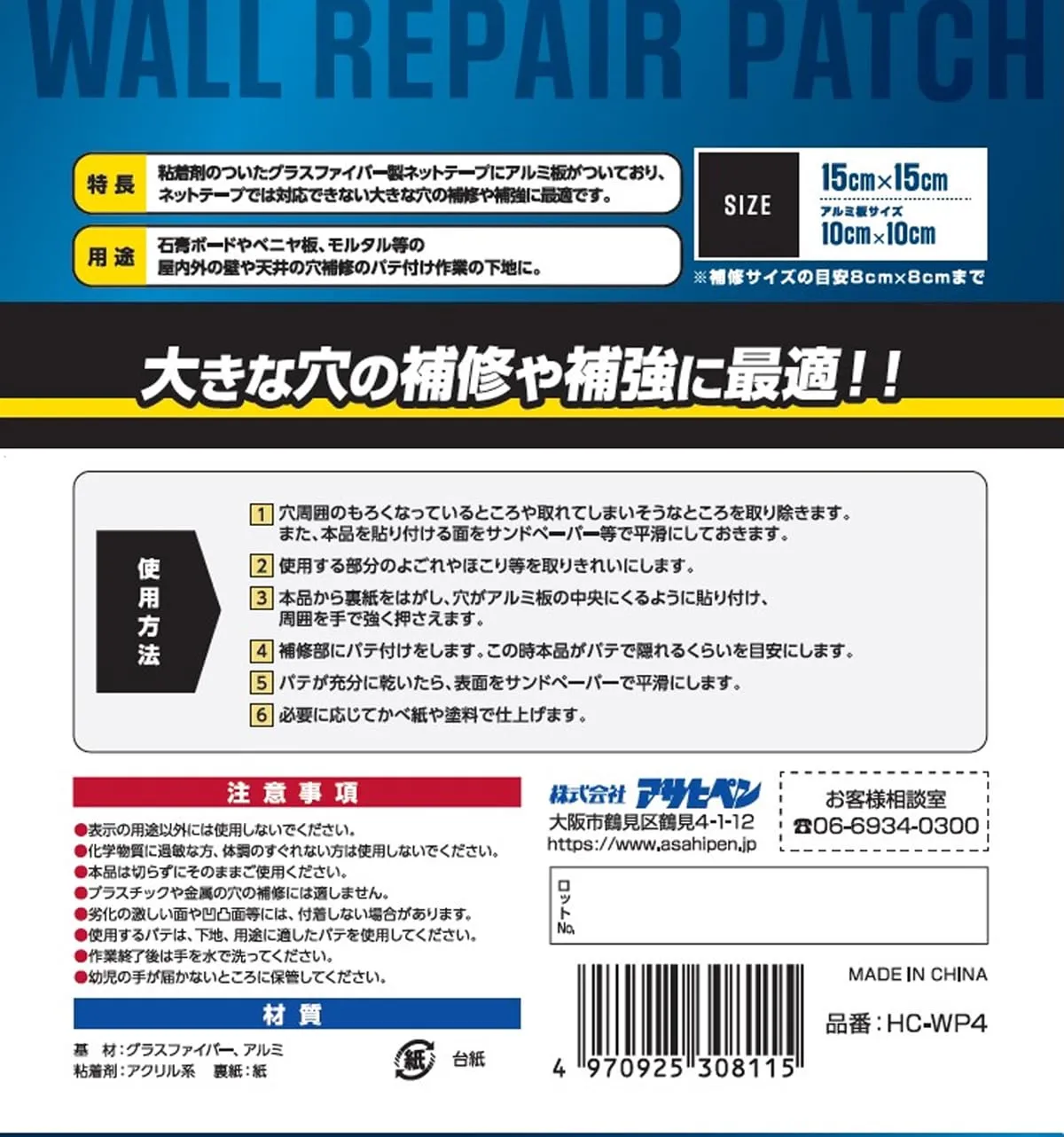 新品 アサヒペン 壁穴補修 大穴補修用 ウォールリペアパッチ HC-WP4 15cm×15cm(アルミ板10cm×10cm) アルミ板入りプレート 穴埋め用 補修 補強 石膏ボード パテ埋め作業用 DIY