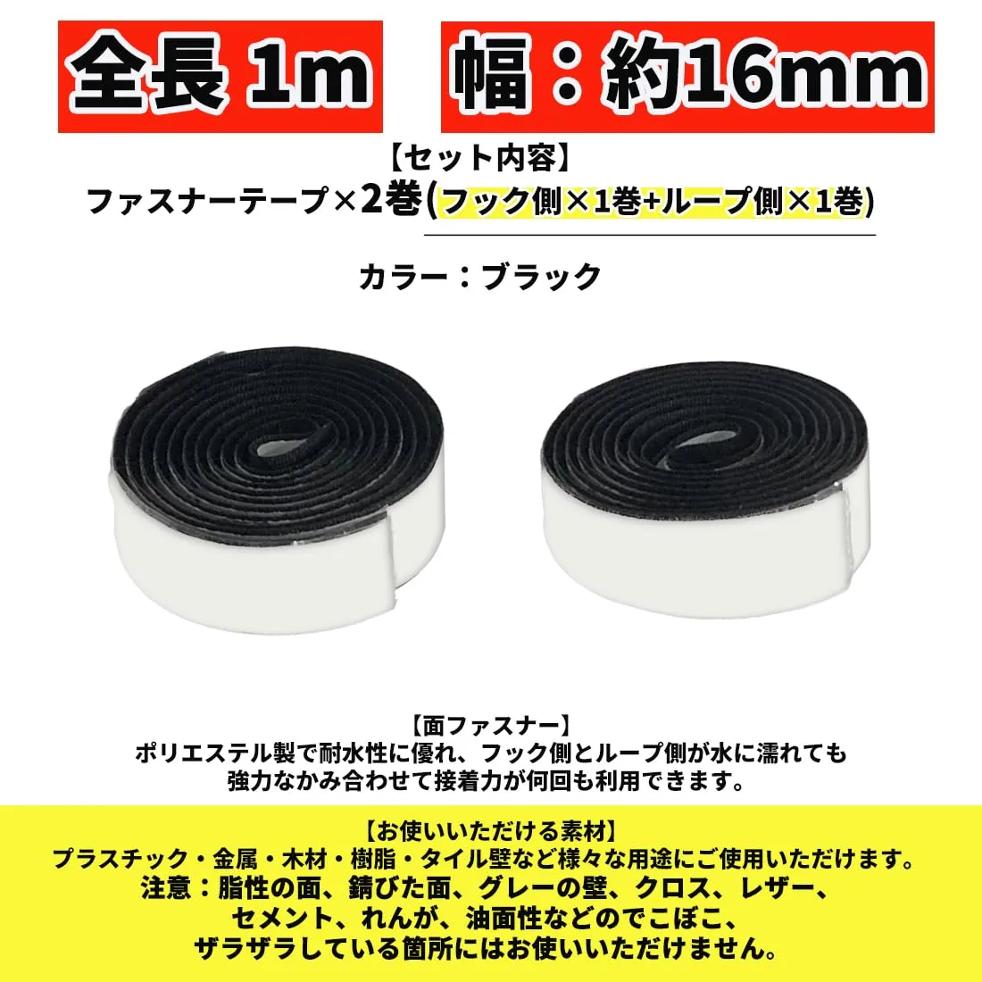 【セット内容】ファスナーテープ×2巻(フック側×1巻+ループ側×1巻)、カラー:ブラック、幅:約16mm、全長:1m。