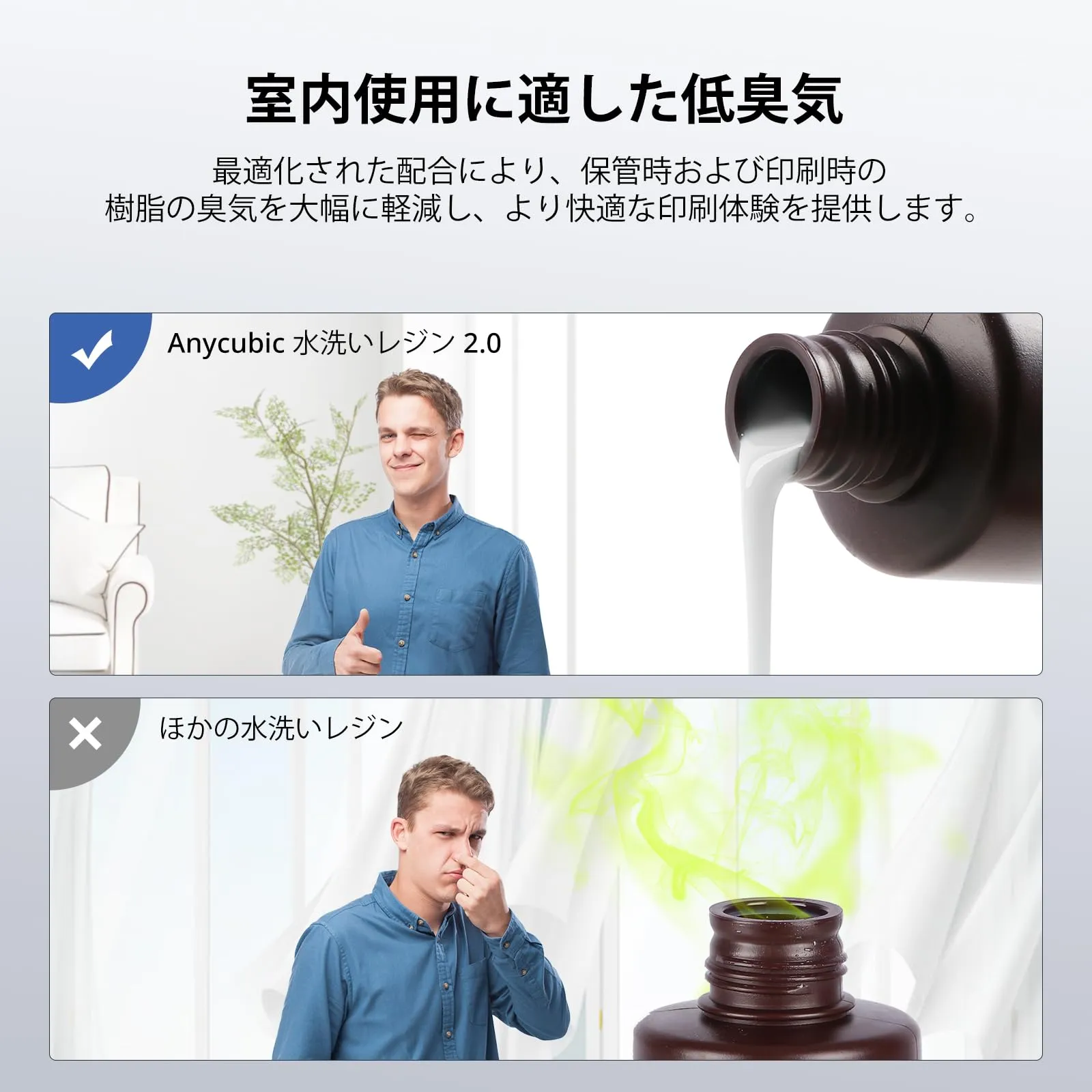 【低臭気・安全】ANYCUBICの水洗い可能なフォトポリマー樹脂は、低臭気であり、お客様により良い印刷体験を提供することができます。