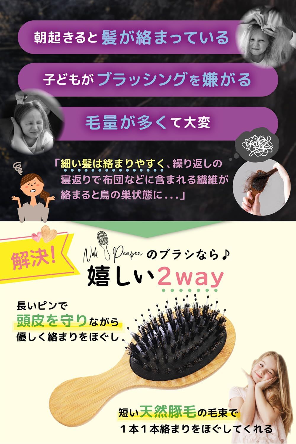 【2WAY仕様】初めに丸形ナイロンピンで大まかにほぐし、次に毛束のある豚毛でしっかりと梳かす。これ1本で絡まる髪もきれいに梳かせます。 ★