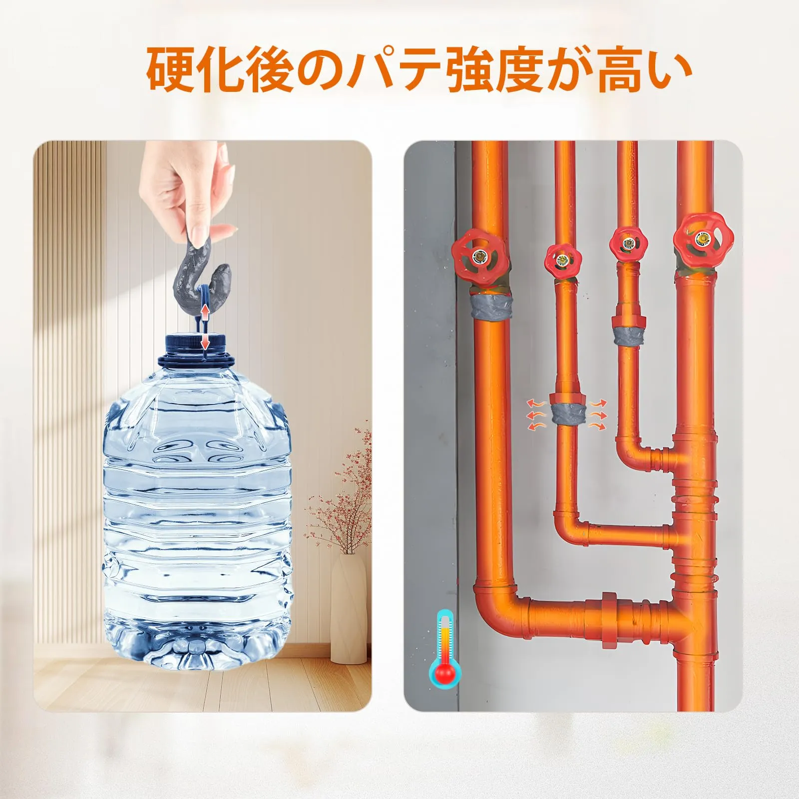 【耐水性】防水パテ 耐水性があり、水道管や器具の修理に使用可能です。 ※硬化目安時間表面硬化:10~15分 完全硬化:16時間 完全硬化後は水中使用可能。