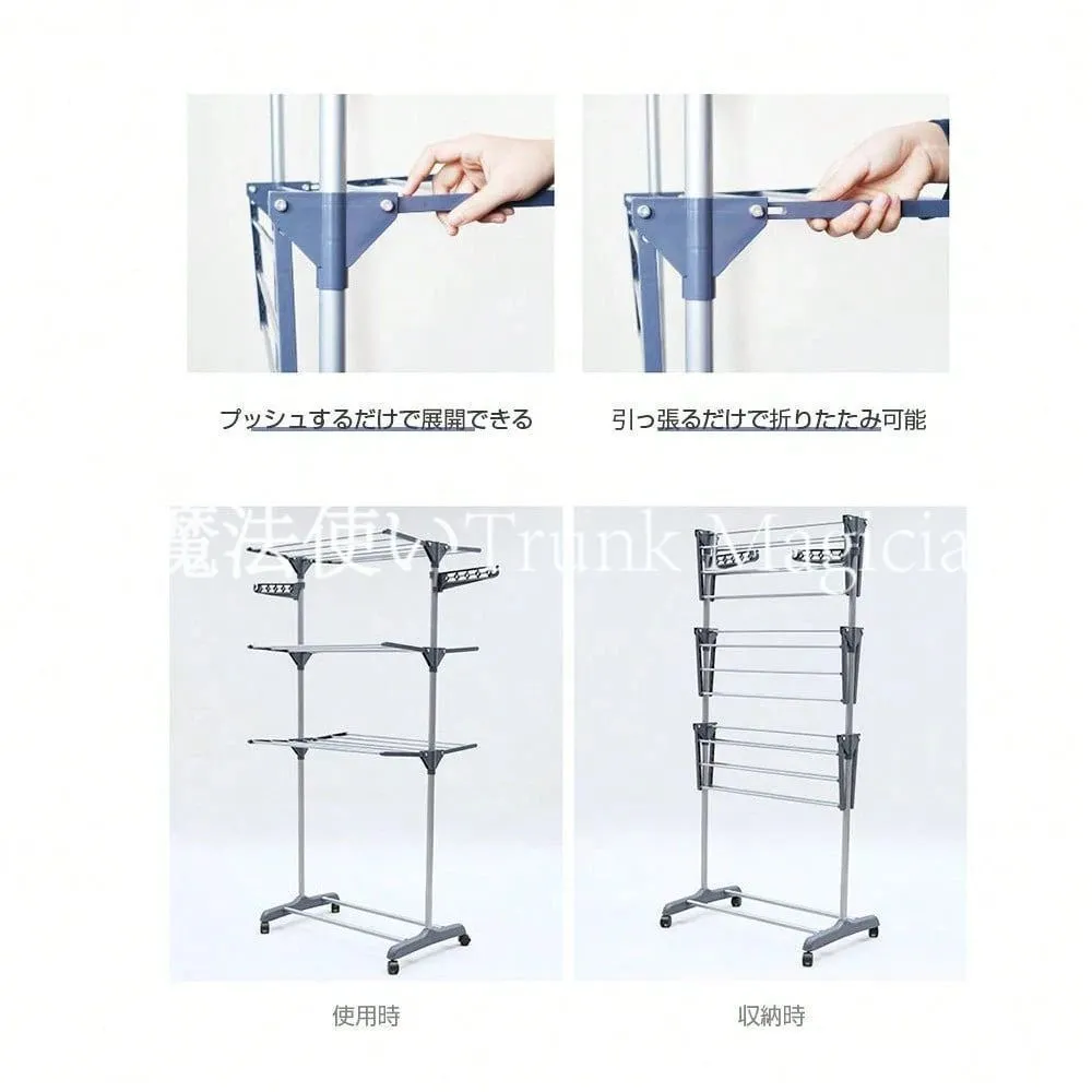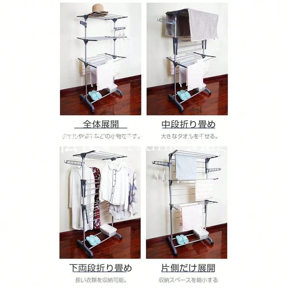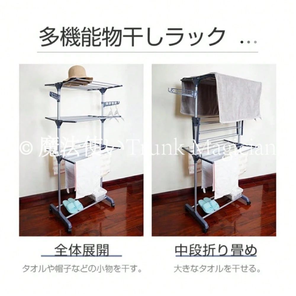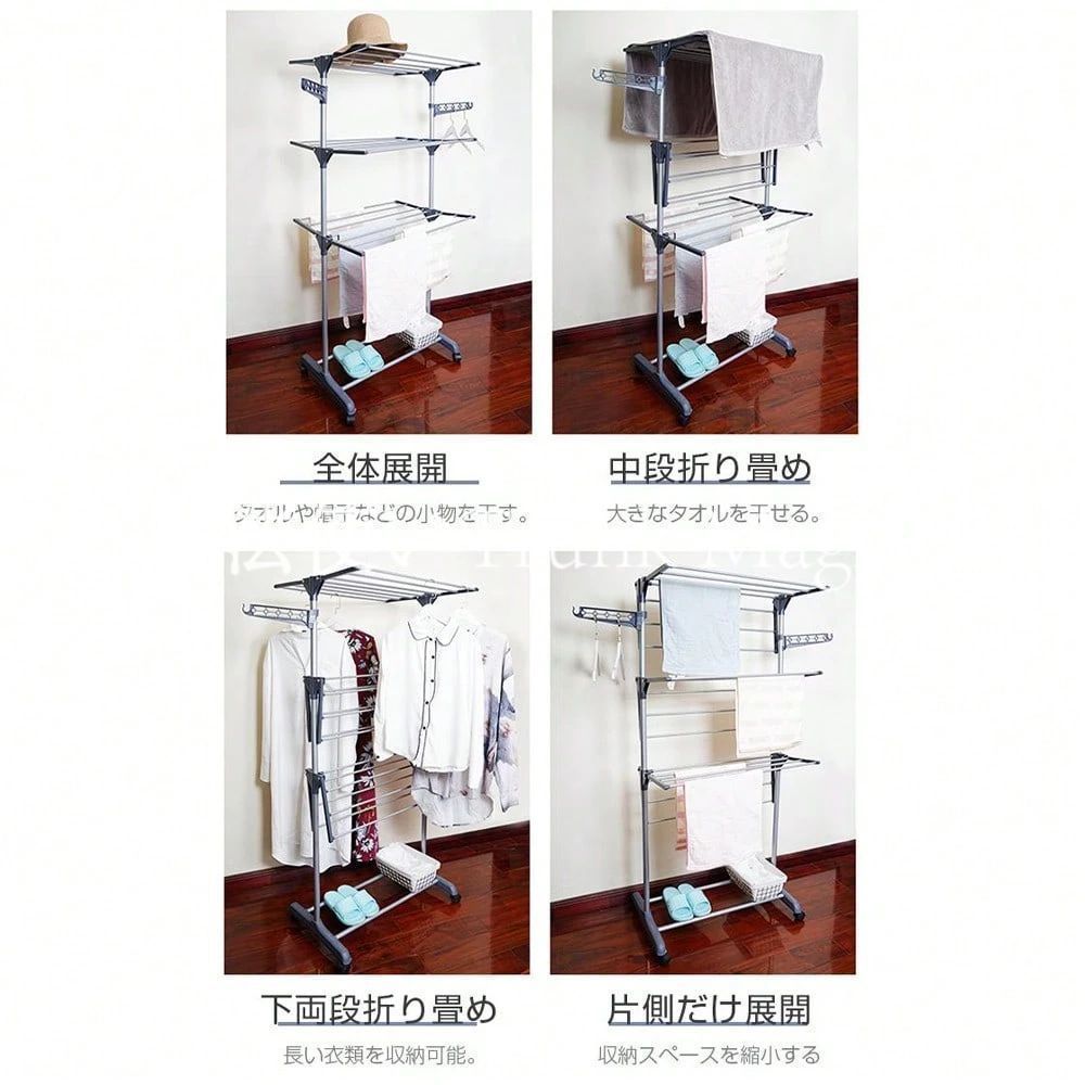 ●多機能収納ペース 物干し棚が折りたたむことで、片側だけを使用することも可能。室内と室外に乾燥しても良いし、室内に服などを収納するためにも使用できます。使用しない時はコンパクトに折りたたんで収納できます。