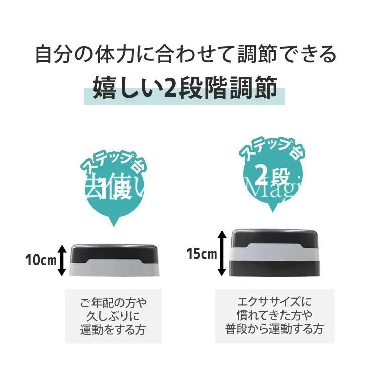 本体背面に収納してある調整台で二段階の高さ調整ができるので、体力にあわせてエクササイズが可能。