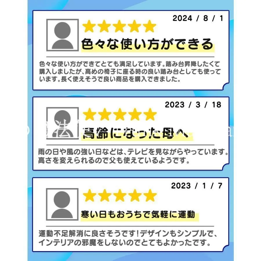 テレビを観ながら、好きな音楽を聴きながら、自分の体力レベルにあった早さでステップを踏むだけ。