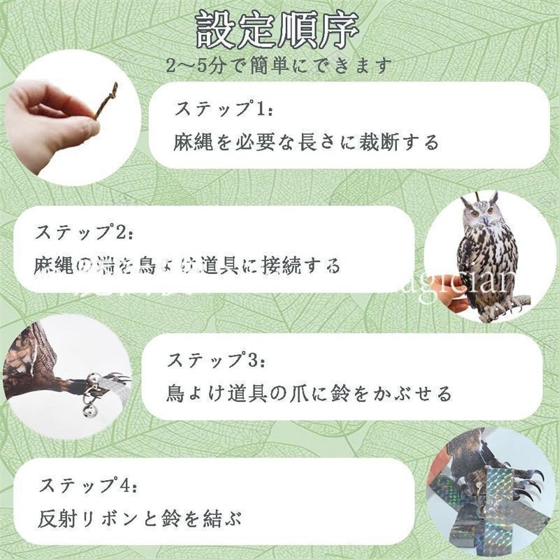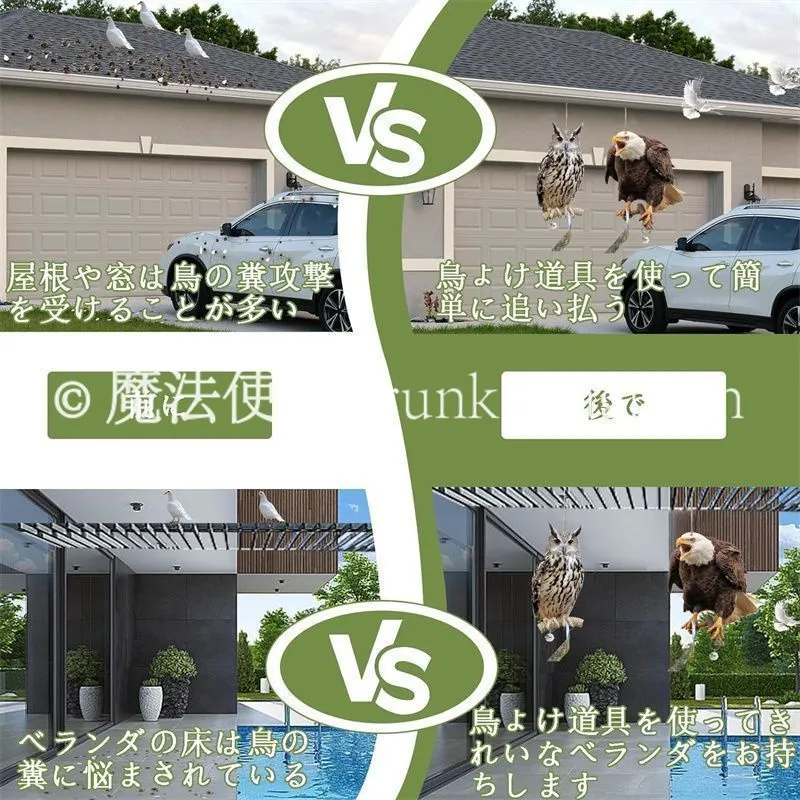 【物理的に鳥たちを撃退】本製品は鳥が傷をつけない前提で鳥よけできます。姿、光を利用して鳥を遠ざけますので、鳥たちを駆除するのではなく寄せ付けない為に開発された商品です。また鳥類保護協会(RSPB)の要求に満足し、鳥や人に傷つけたり刺したりすることはありません。人にも鳥にも優しい鳥対策グッズです。 送料について ・全国送料無料(以下の地域を除く) ・沖縄県、離島地域には別途2,800円の送料がかかります。 ・上記の地域には、商品ページにて別途送料を請求させていただきます。 ご注意事項: ※サイズは手作業での採寸のため、1?3cm程度の誤差が生じる場合がございます。 ※モニター環境や撮影時の光加減により、実際の商品の色味が画像と若干異なる場合がございます。 ※生産工程上、ごくわずかな縫製のズレや糸のほつれ・匂いなどが見られる場合がございますが、品質には問題ございません。 ※イメージ違いによる返品・交換はご遠慮いただきますようお願い申し上げます。