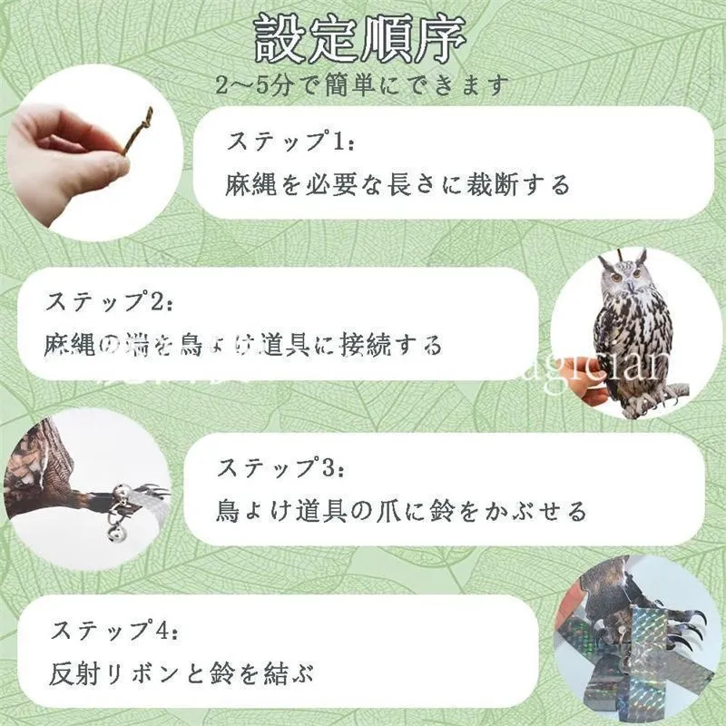 【取り付け簡単】屋外用鳥よけは取り付けと取り外しが簡単で、他の道具は必要なく、ロープで木や窓に吊るすことができます。私たちの実用的で美しいデザインは、時間とエネルギーを節約し、鳥を撃退するのに役立ちます。設置が簡単なので、手間が省け、屋外スペースを楽しむ時間が増えます。