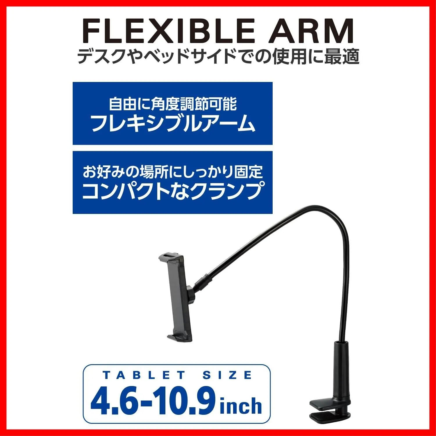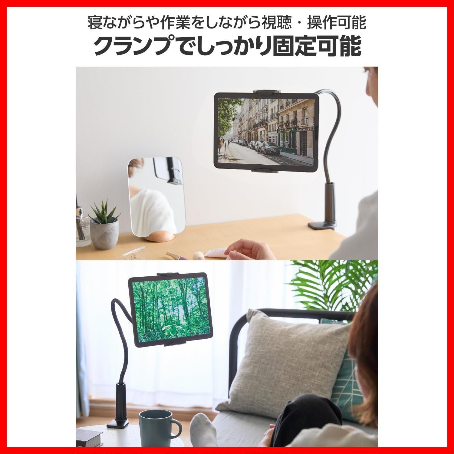 【4.6インチ~10.9インチ対応】 360度回転 自由自在に固定可能 約12mmの太いアームでしっかりキープ TBWDSLARMBK 自由自在に曲がるフレキシブルアームで、機器本体を見やすい角度に調節できる全長約80cmのタブレットスタンドです。 デスクやベッドルームのサイドテーブルなど、お好みの場所にクランプでしっかり固定可能。寝ながらや作業をしながらタブレットの視聴、操作ができます。 直径約12mmの太いアームで、アームのアングルをしっかりキープします。 4.6インチ~10.9インチのタブレット・スマートフォン対応の大型ホルダーで、機器本体を簡単に着脱できます。 ホルダー内側には、タブレットのズレを防ぎ傷を防止する保護シートが付いています。